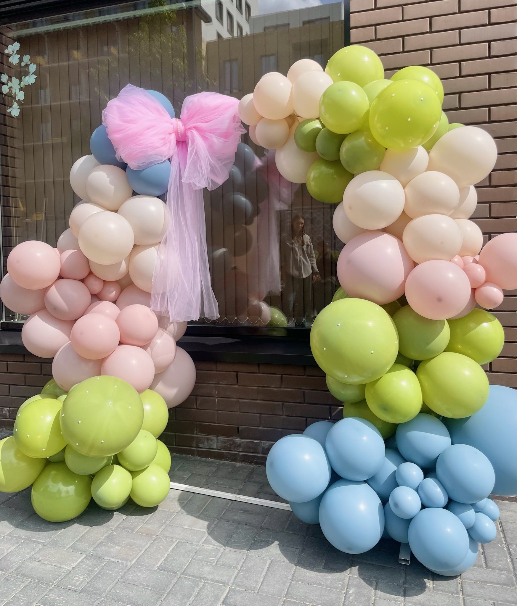 Фотозона на полукруглом каркасе с бантом из фатина