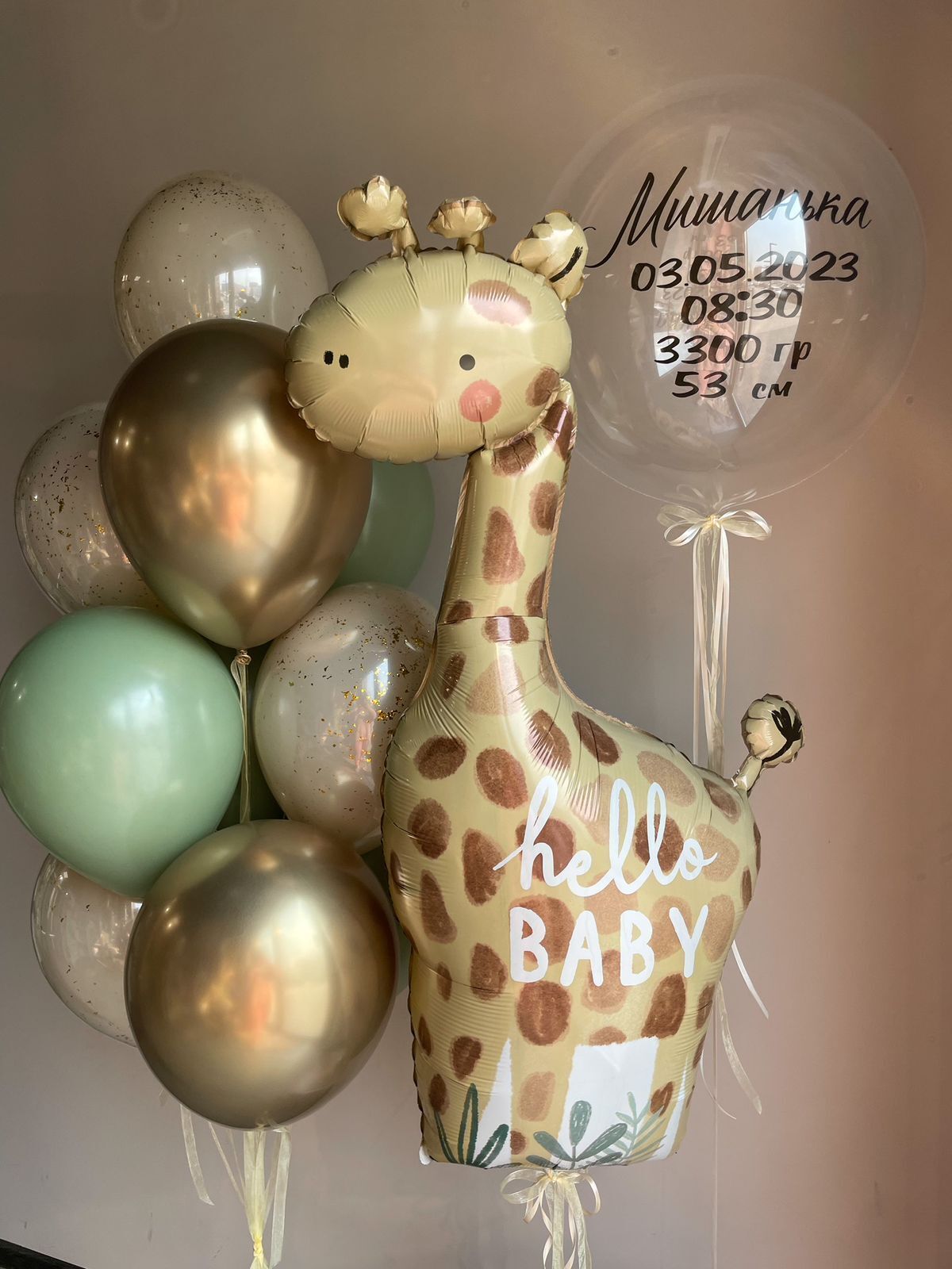 • Фонтан из 10 шаров (3 хром золото, 3 эвкалипт, 4 белый песок дабл стафф с конфетти)