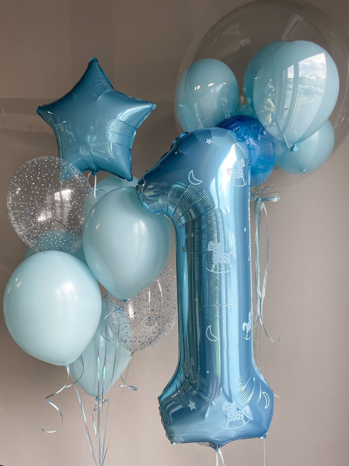 • Фонтан из 8 шаров (голубая звезда, 5 голубой макарунс, 2 прозрачных с конфетти)