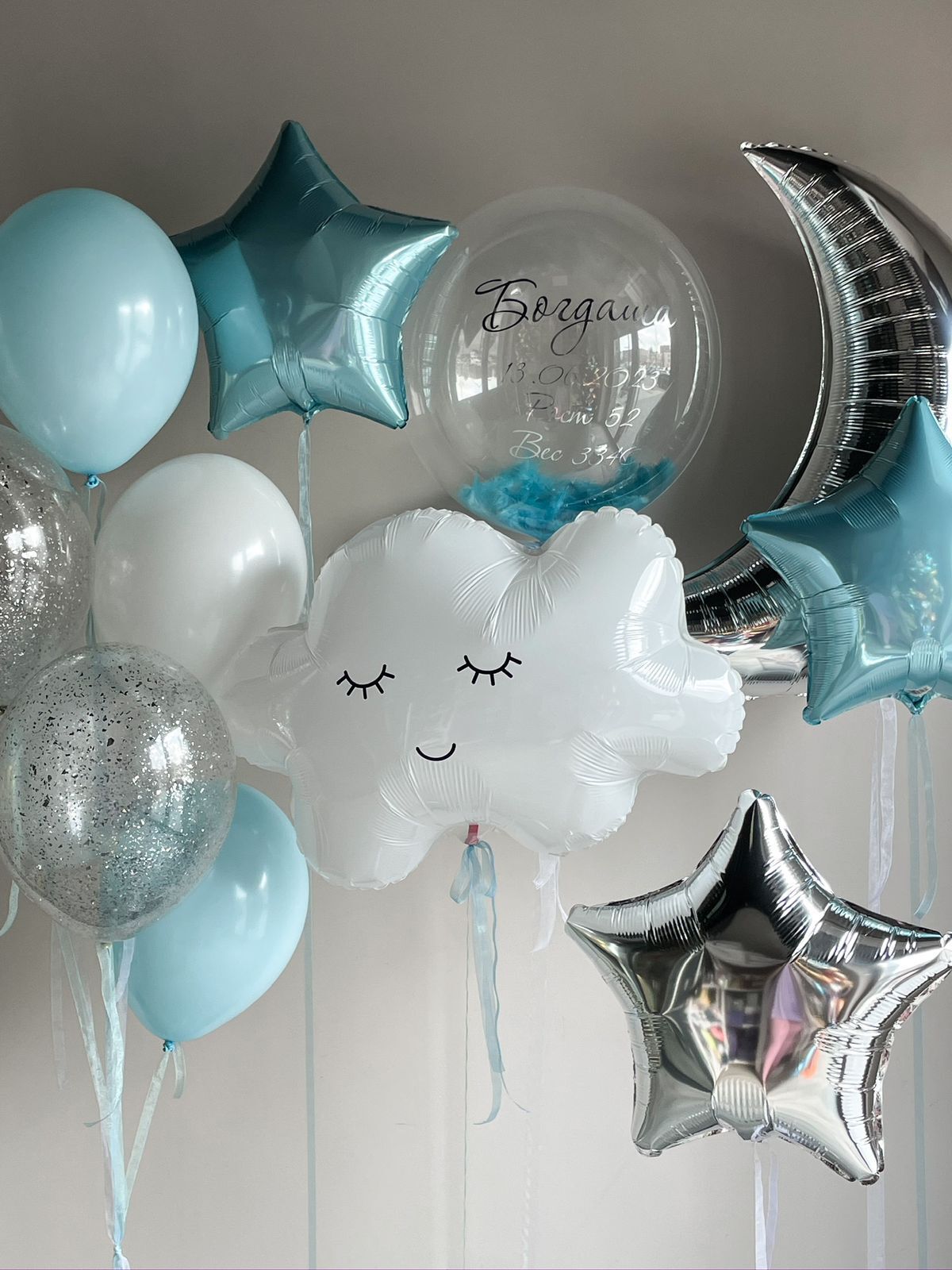 • Фонтан из 6 шаров (2 белых, 2 голубой макарунс, 2 прозрачных с конфетти)