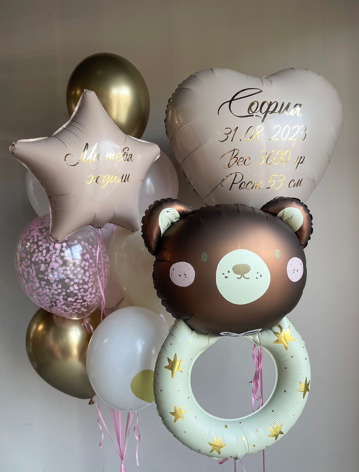 • Фонтан из 10 шаров (звезда с надписью, 2 хром золото, 2 розовый макарунс, 2 белых, 2 белый песок, 1 прозрачный с конфетти)