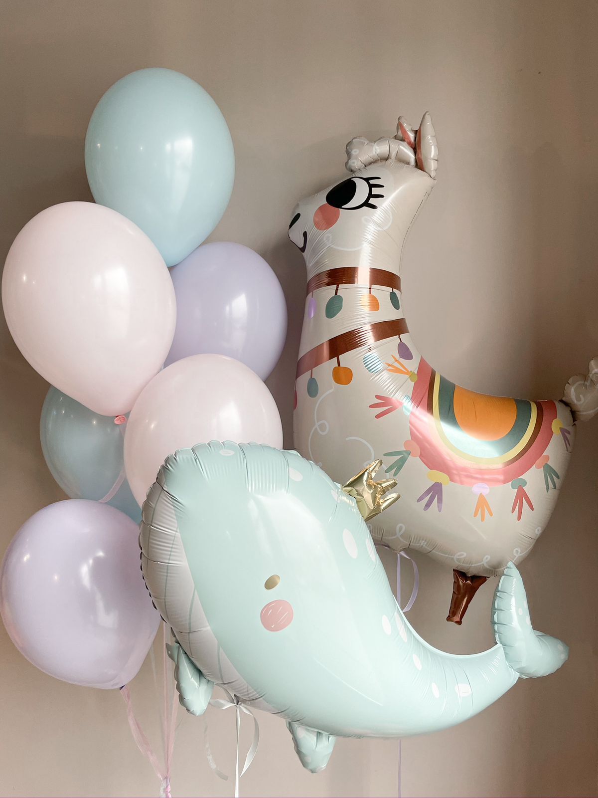 • Фонтан 7 шаров (3 голубой макарунс, 2 розовый макарунс, 2 сиреневый макарунс)