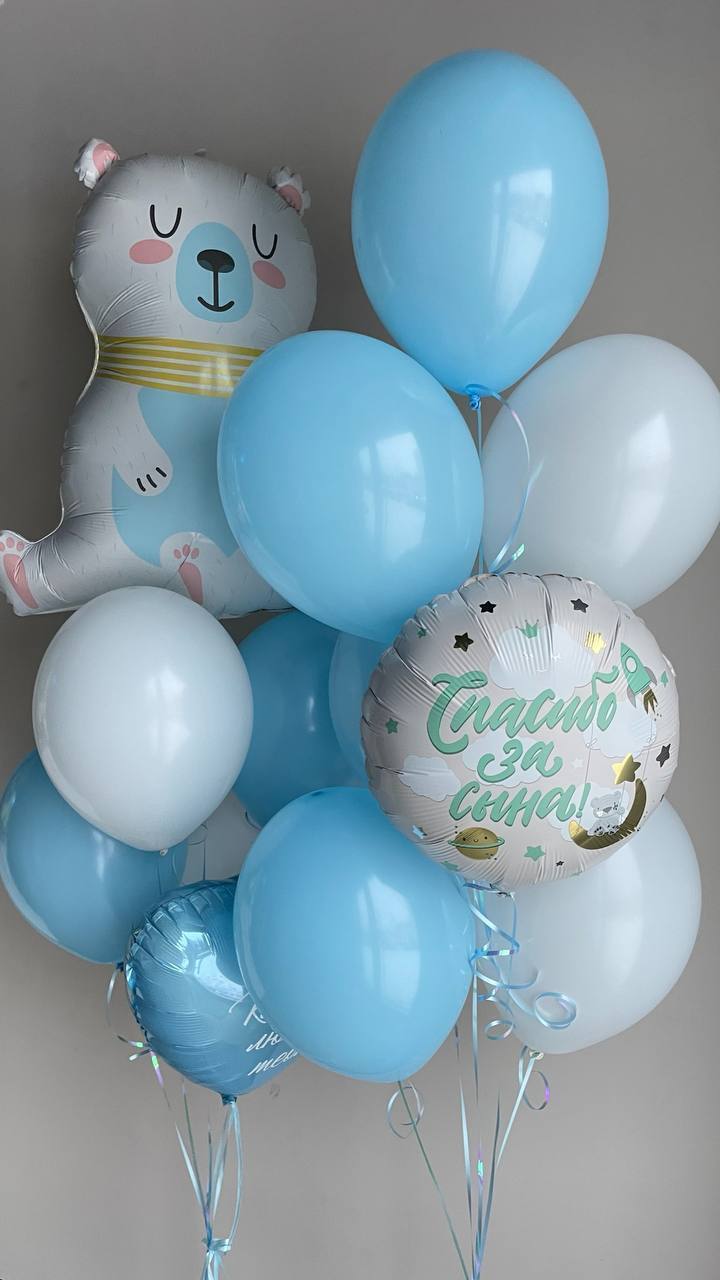 • Фонтан 6 Шаров (фигурка «Белый мишка», 2 голубых, 2 белых, сердце с индивидуальной надписью)