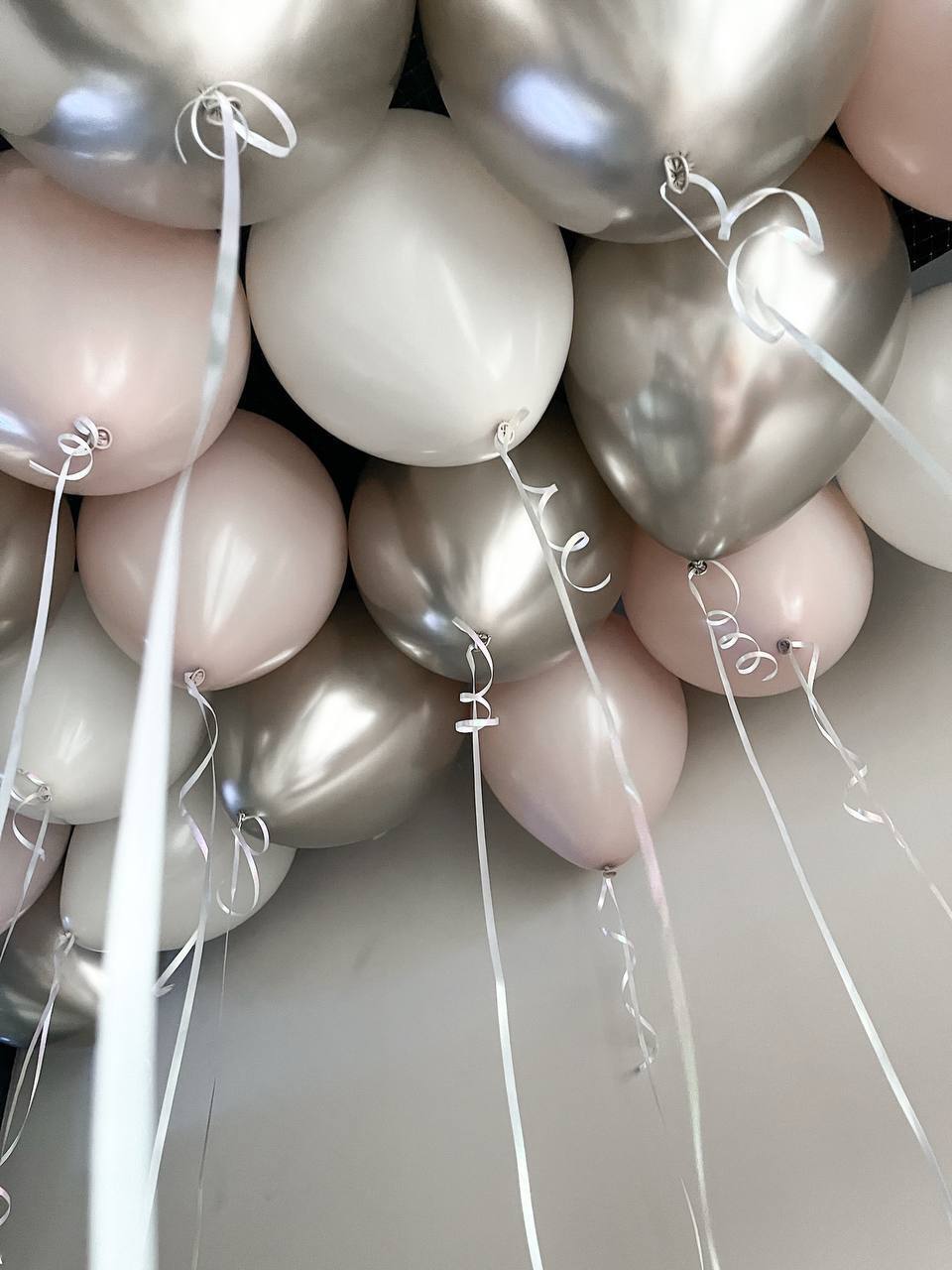 • 20 шаров под потолок (6 хром Шампань, 7 пыльная Роза, 7 белых)