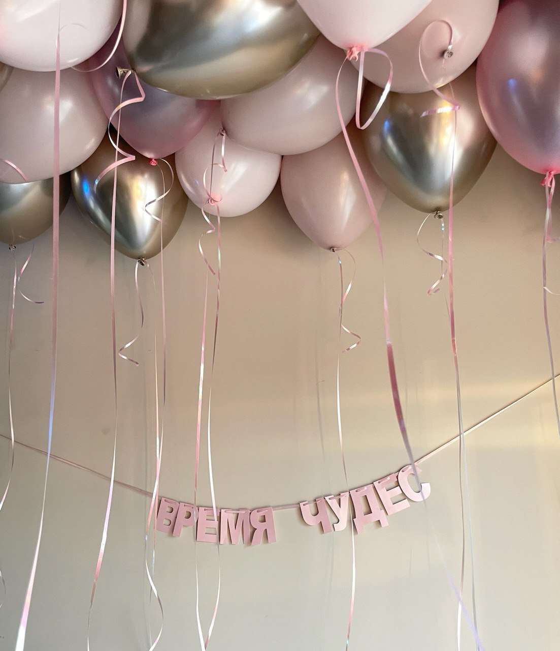 • 15 шаров под потолок (5 хром Шампань, 3 розовый перламутр, 4 пыльная Роза, 3 розовый макарунс)