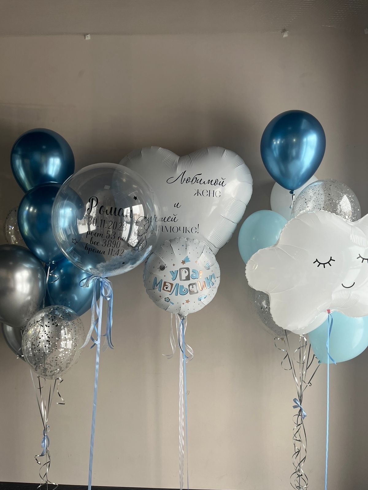• Фонтан из 8 шаров (2 хром синий, 2 белых, 2 голубой макарунс, 2 прозрачных с серебро конфетти)
