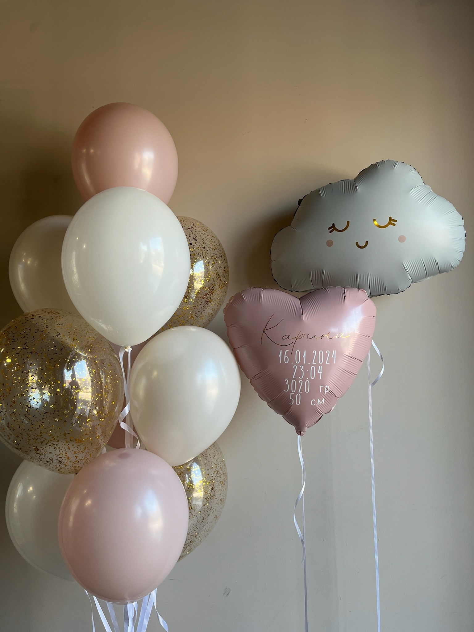 • Фонтан из 10 шаров (3 пыльная Роза, 2 белых, 2 крем, 3 прозрачных с конфетти)