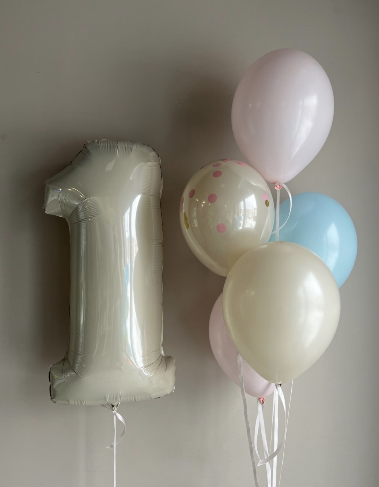 • Фонтан из 5 шаров (1 дабл стафф белый песок с конфетти, 2 розовый макарунс, 1 голубой макарунс, 1 белый песок)