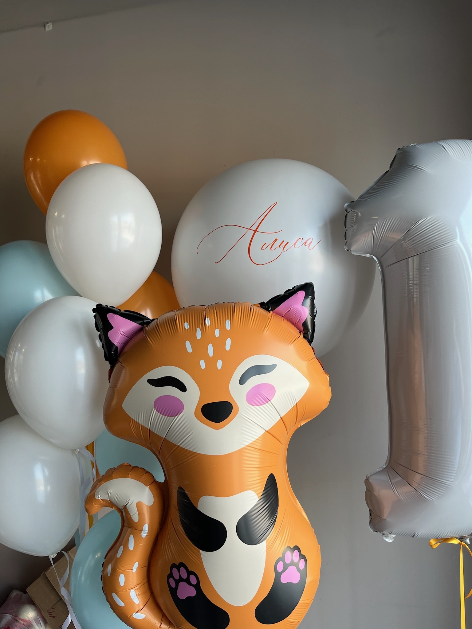 • Фонтан из 10 шаров (4 белых, 3 голубых, 3 оранжевых)