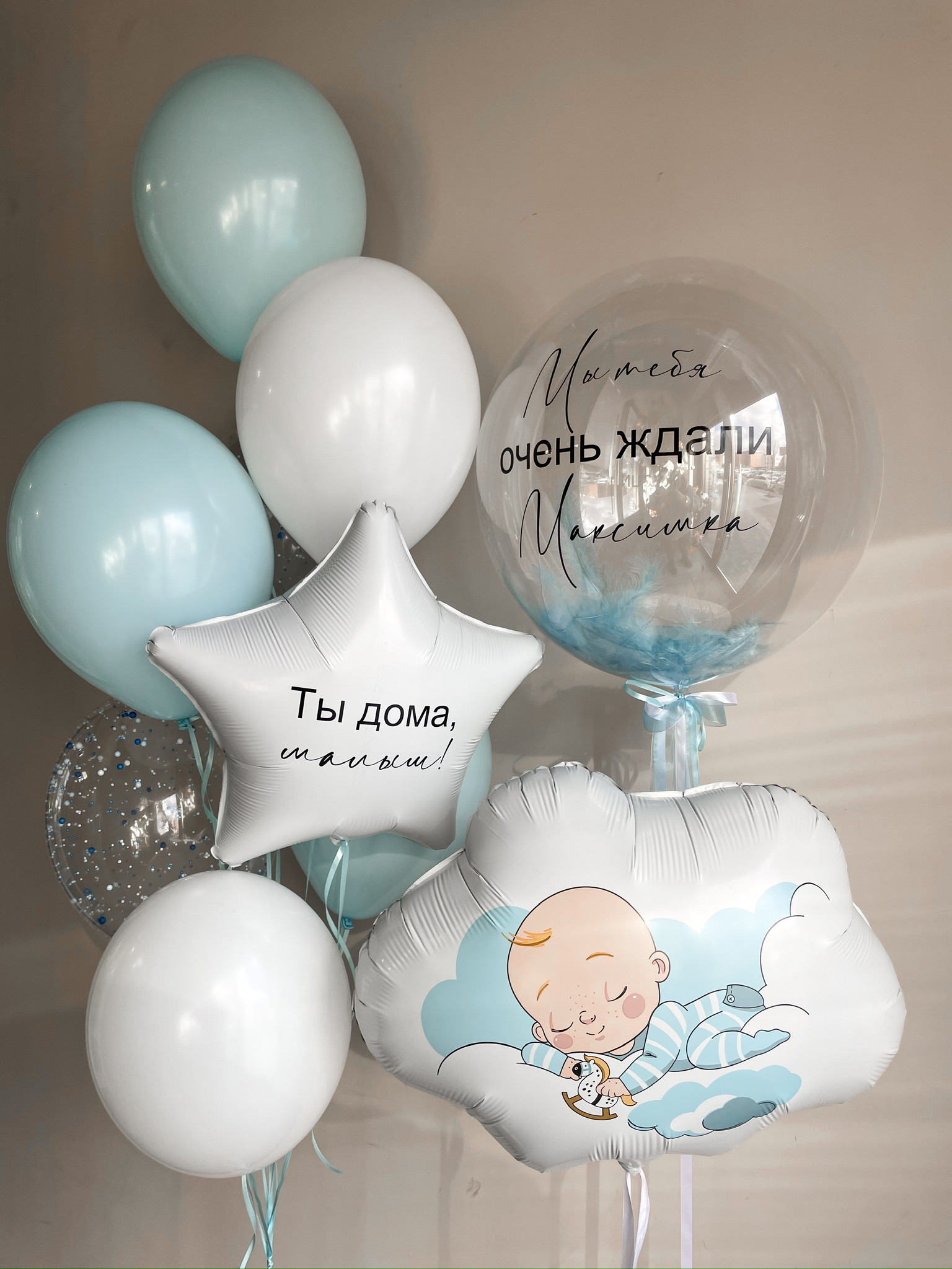 • Фонтан из 8 шаров (звезда с индивидуальной надписью, 3 голубой макарунс, 2 белых, 2 прозрачных с конфетти)