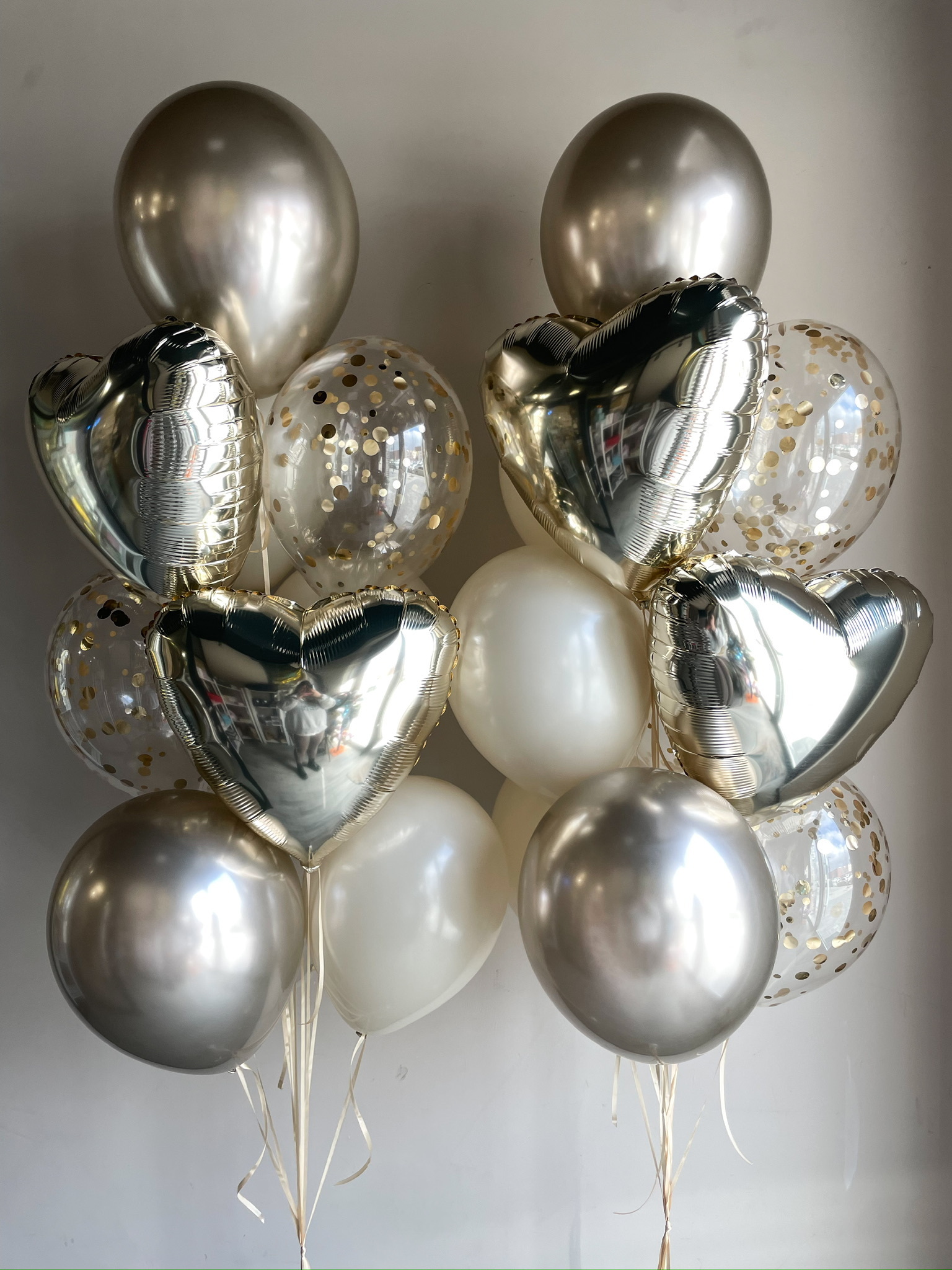 2 фонтана по 10 шаров (3 обычных, 3 с конфетти, 2 хром, 2 сердца)