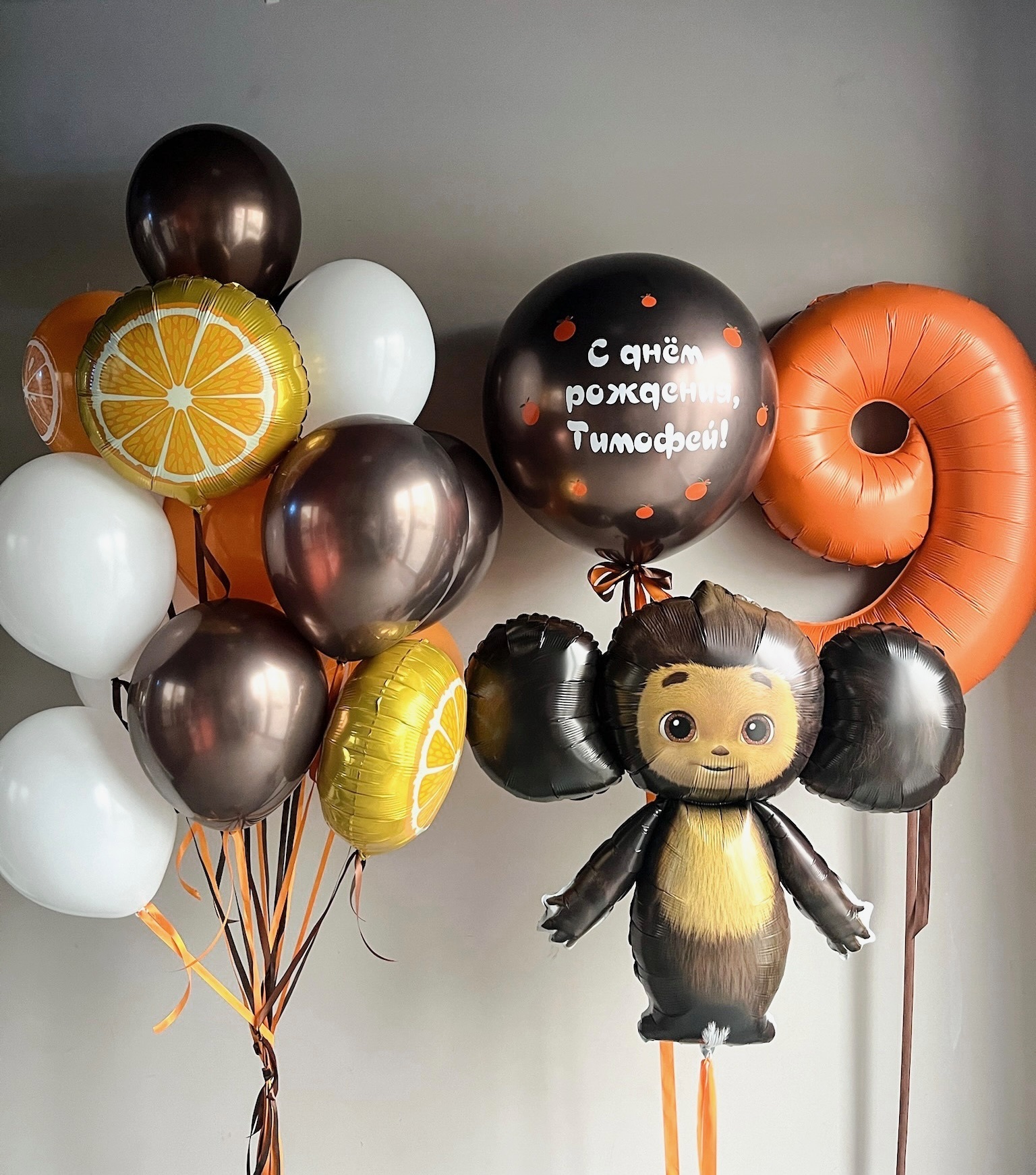 Фонтан из 15 шаров (5 белых, 5 хром трюфель, 3 латекс апельсин, 2 круг апельсин)