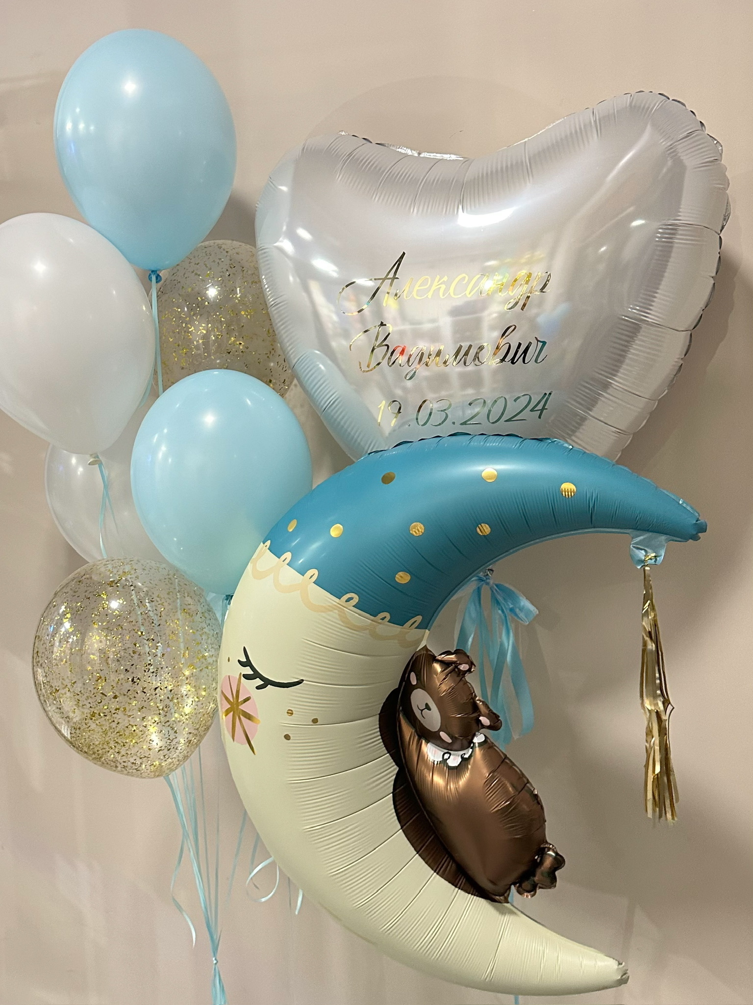 • Фонтан из 7 шаров (3 голубой макарунс, 2 белых, 2 прозрачных с золотой крошкой)