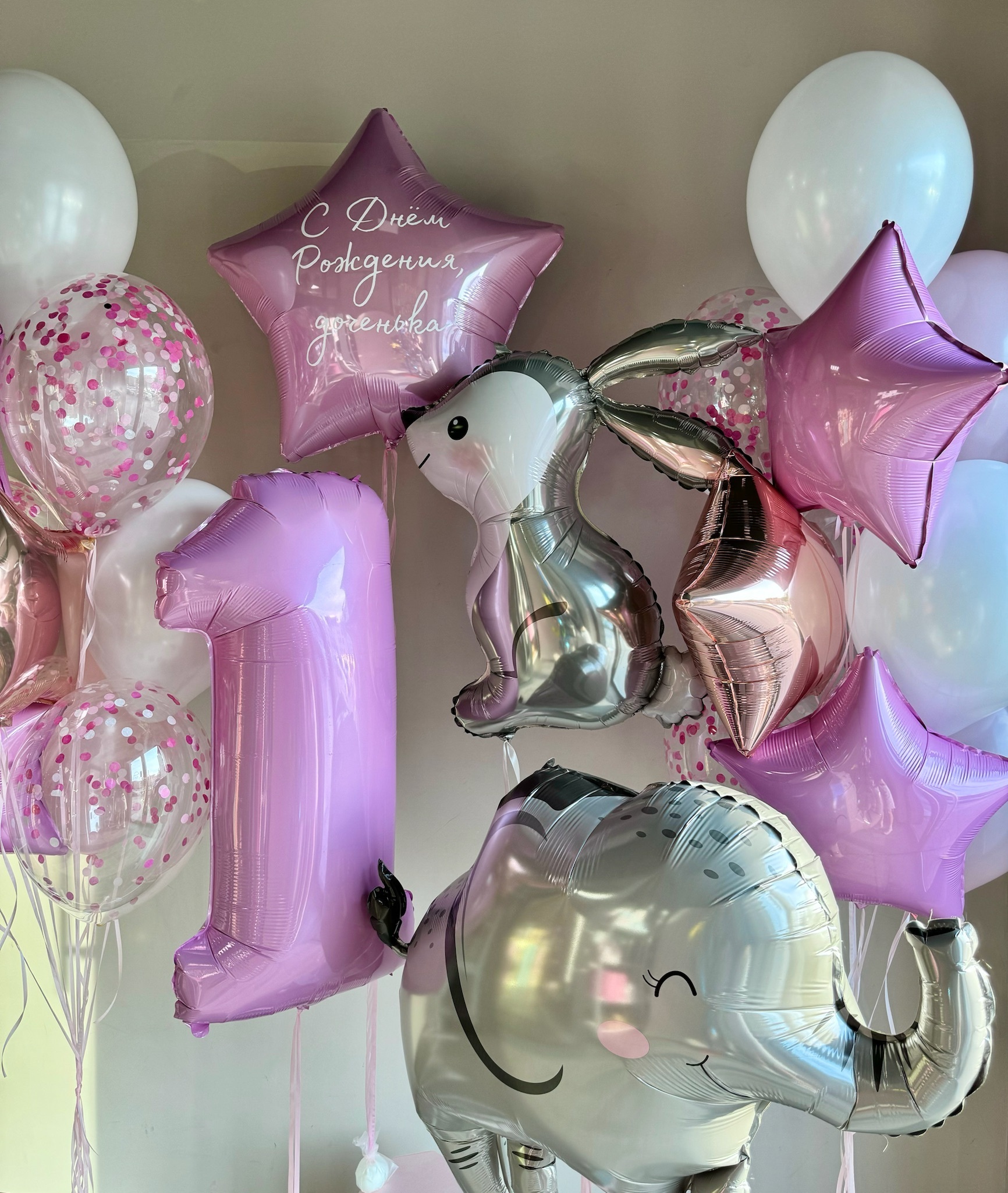 • Два фонтана по 10 Шаров (2 розовых звезды, 1 звезда розовое золото, 3 прозрачных с конфетти, 2 белых, 2 розовый макарунс)