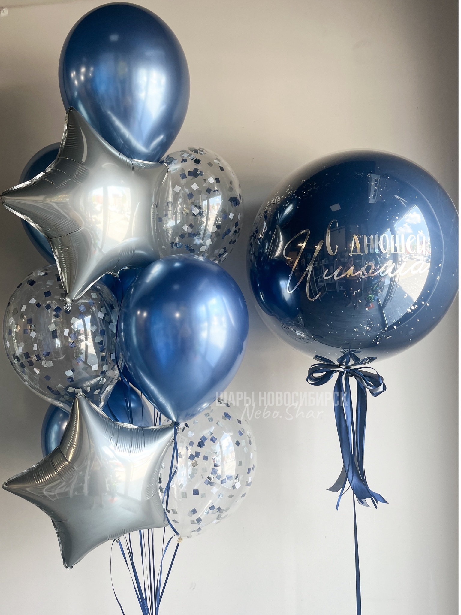 Фонтан из 10 шаров (2 звезды, 3 с конфетти, 5 хром)