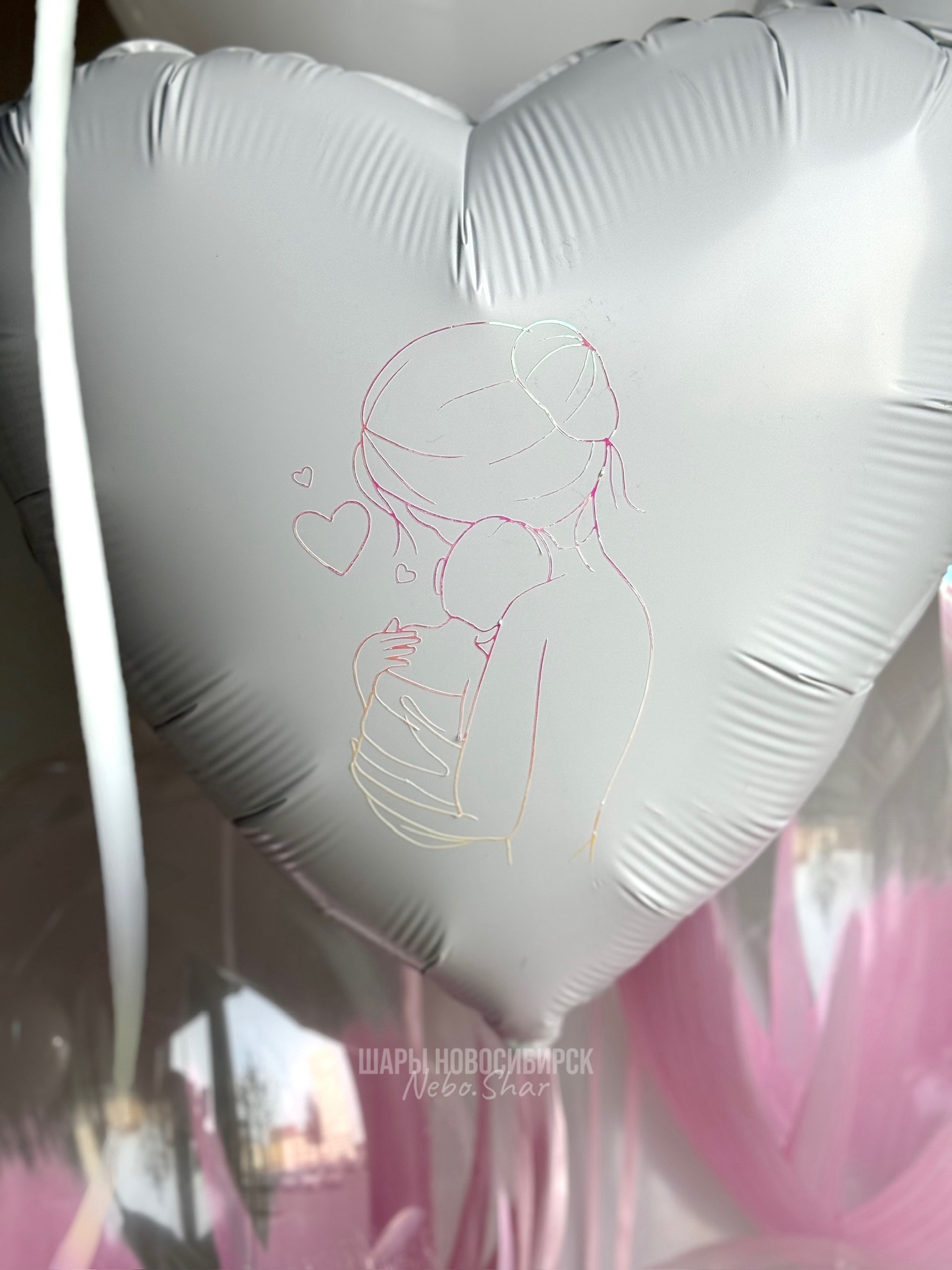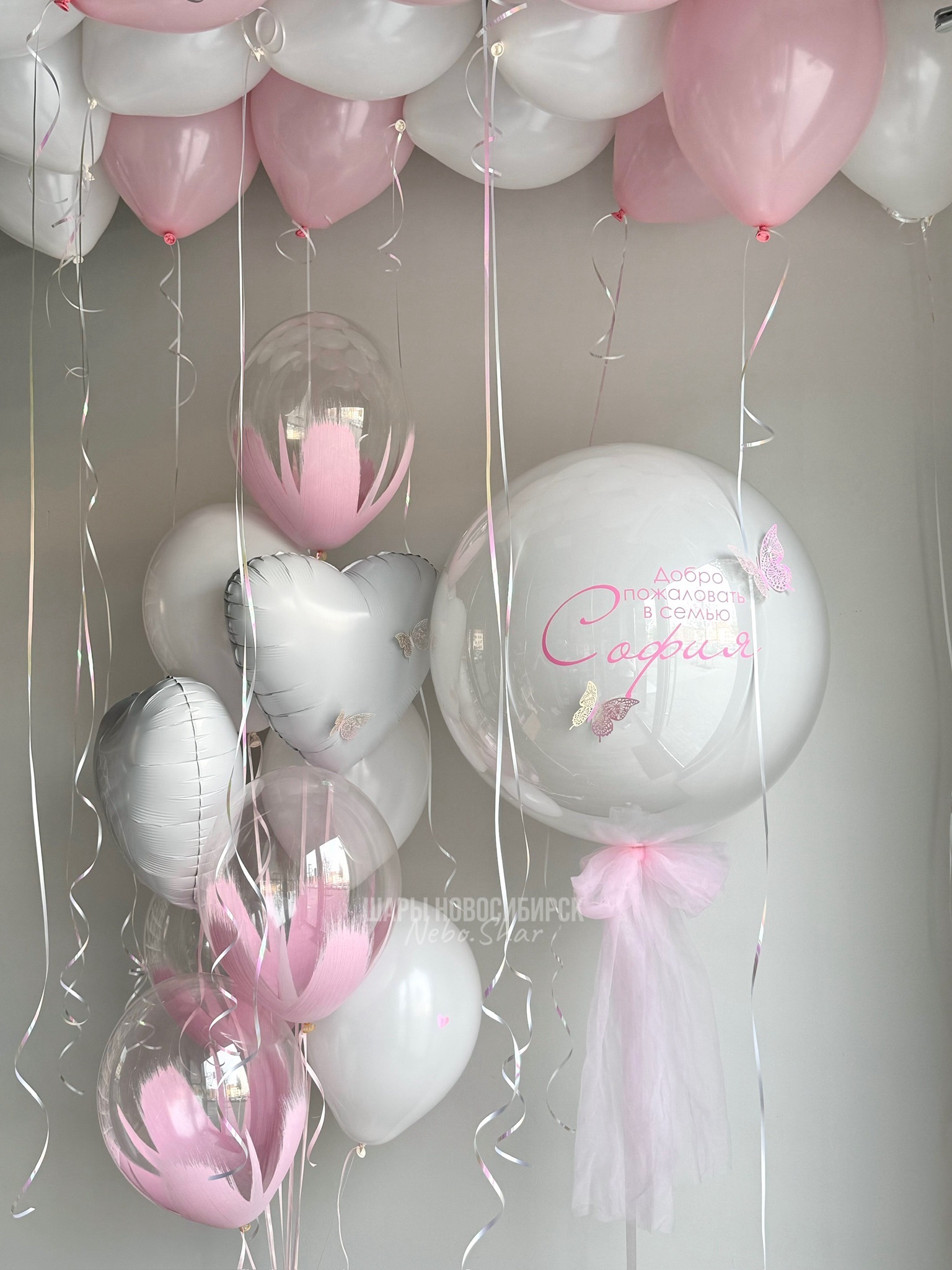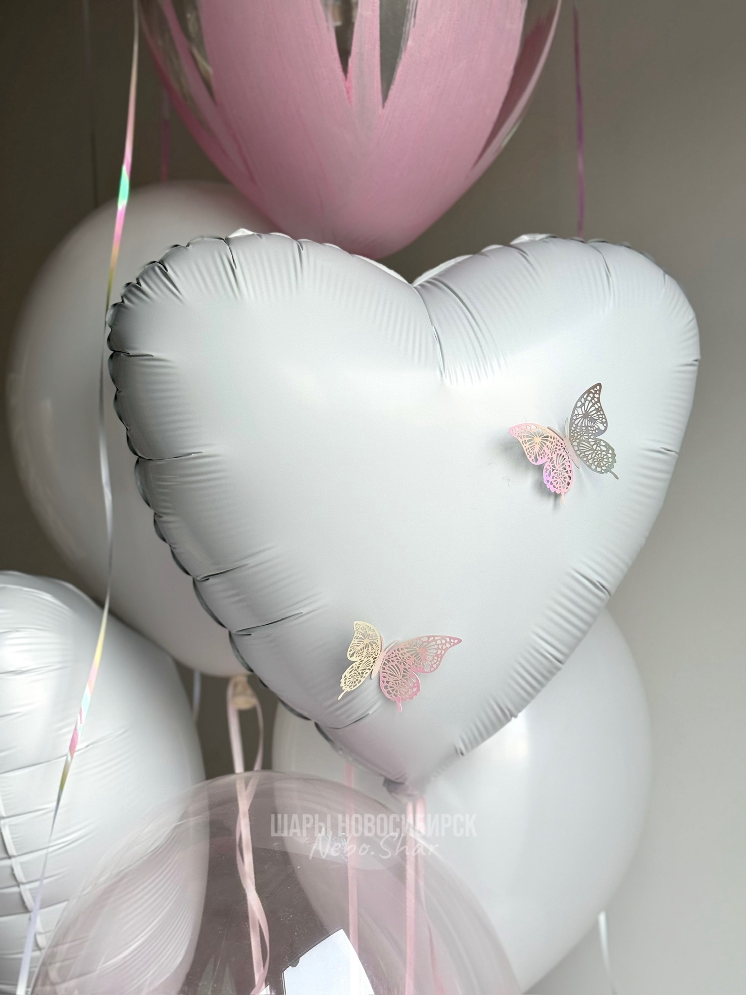 • Фонтан из 9 шаров (сердце с рисунком, сердце с бабочками, 4 розовый браш, 3 белых)