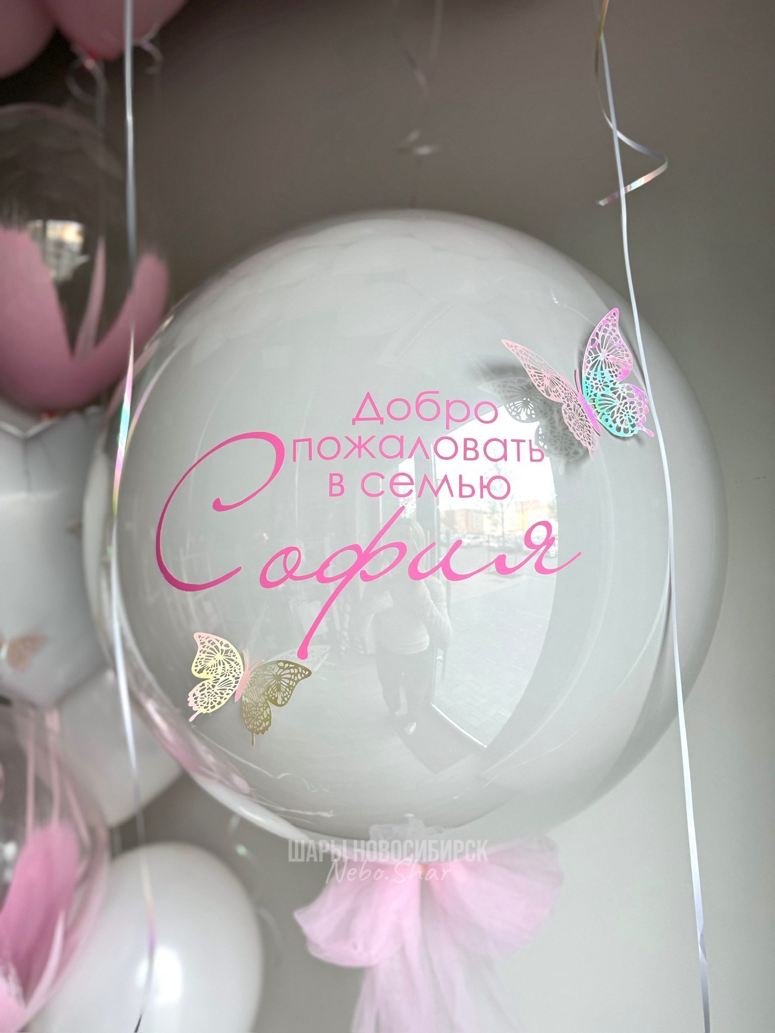 • Стеклянный белый шар с бабочками и надписью, также на шар идет бантик из фатина