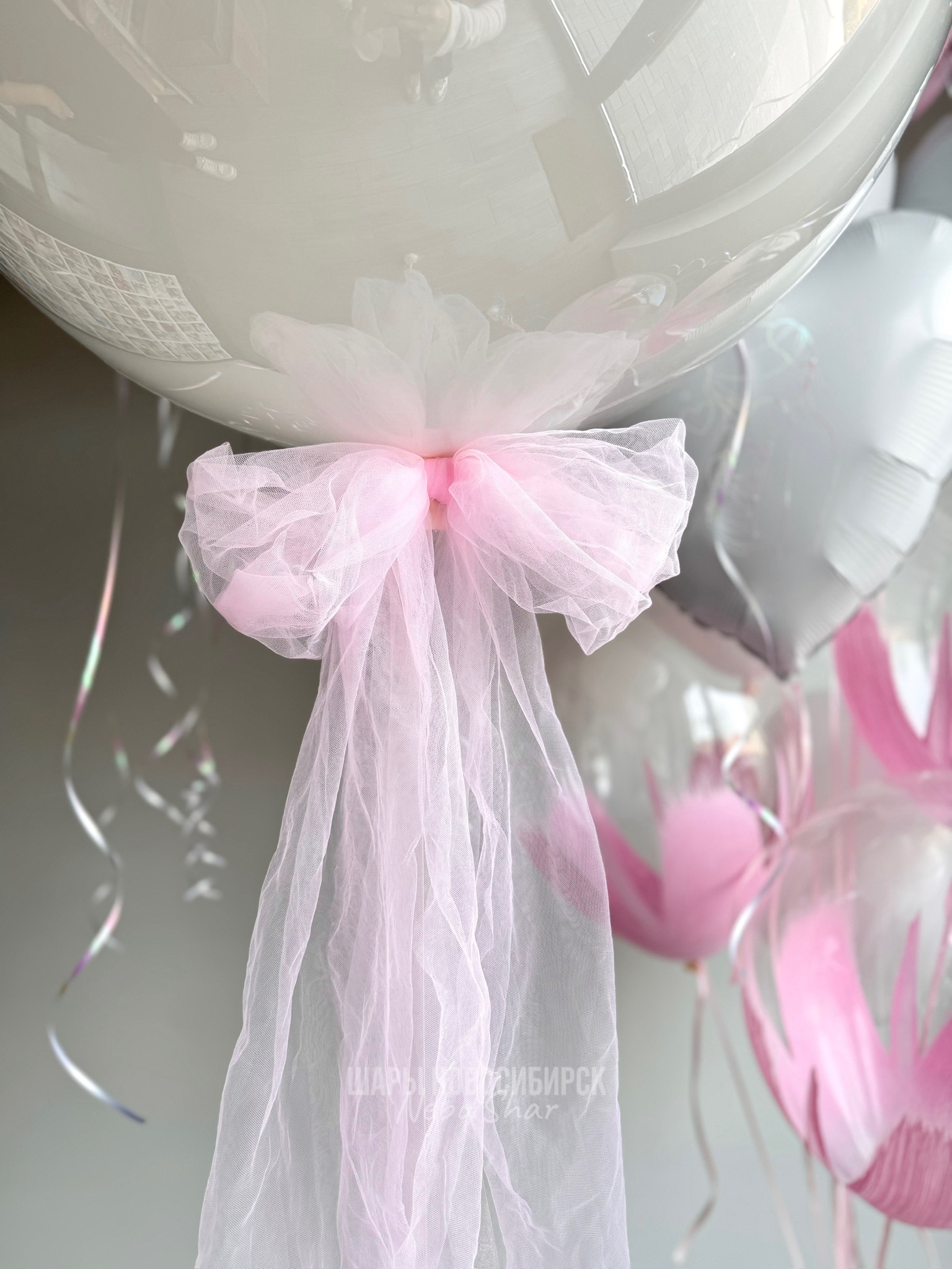 • 15 шаров под потолок (8 розовый бабл гам и 7 белых)