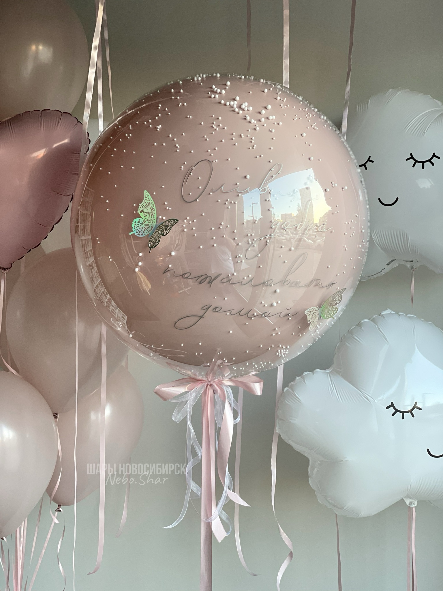 • Стеклянный шар пыльная роза с пенопластом и надписью, также на шар добавлены бабочки