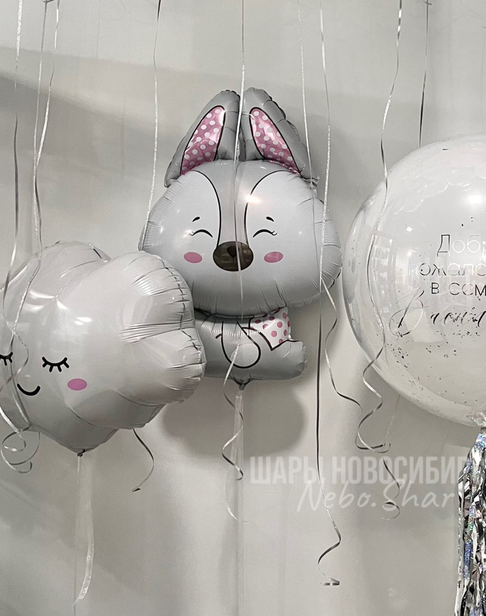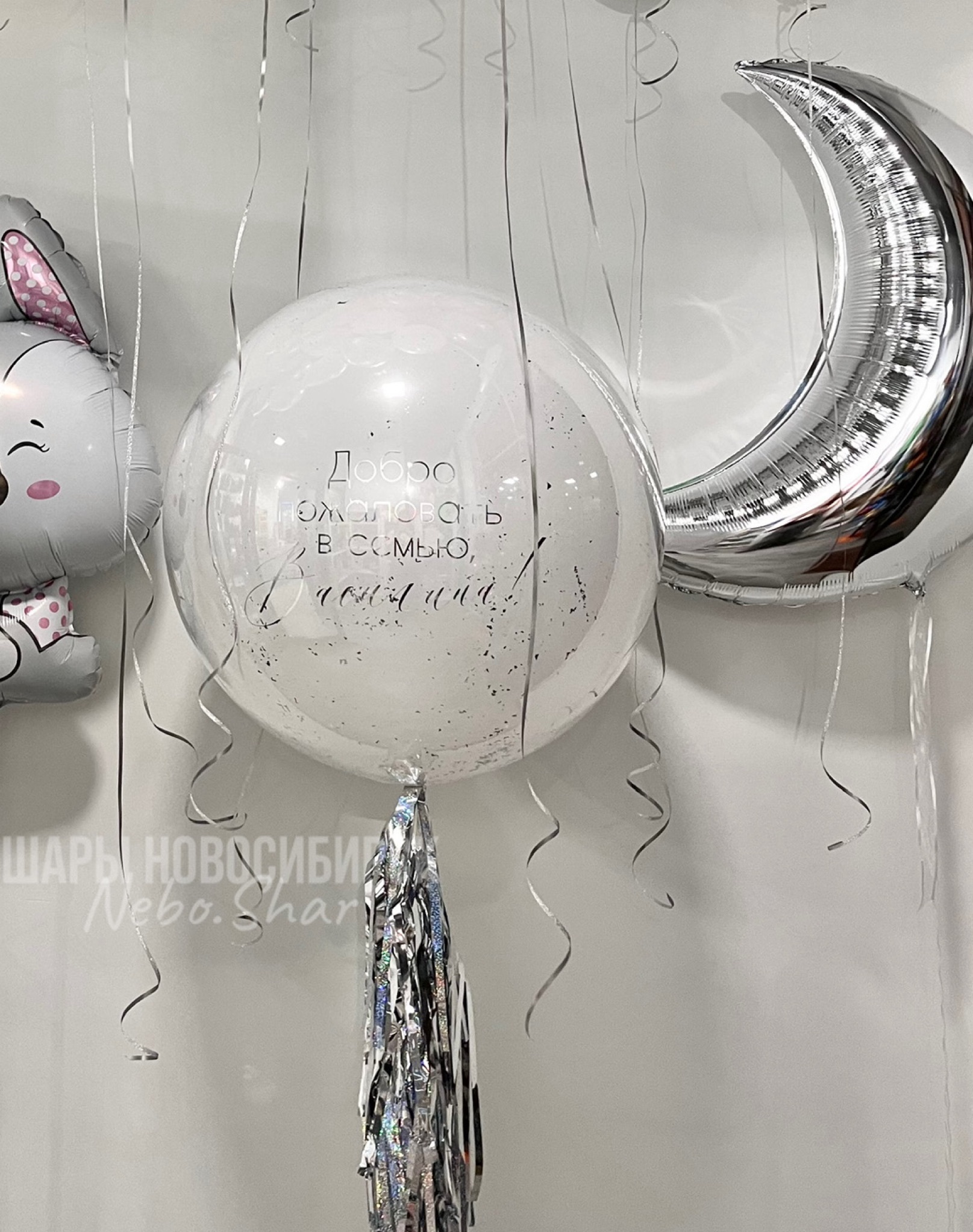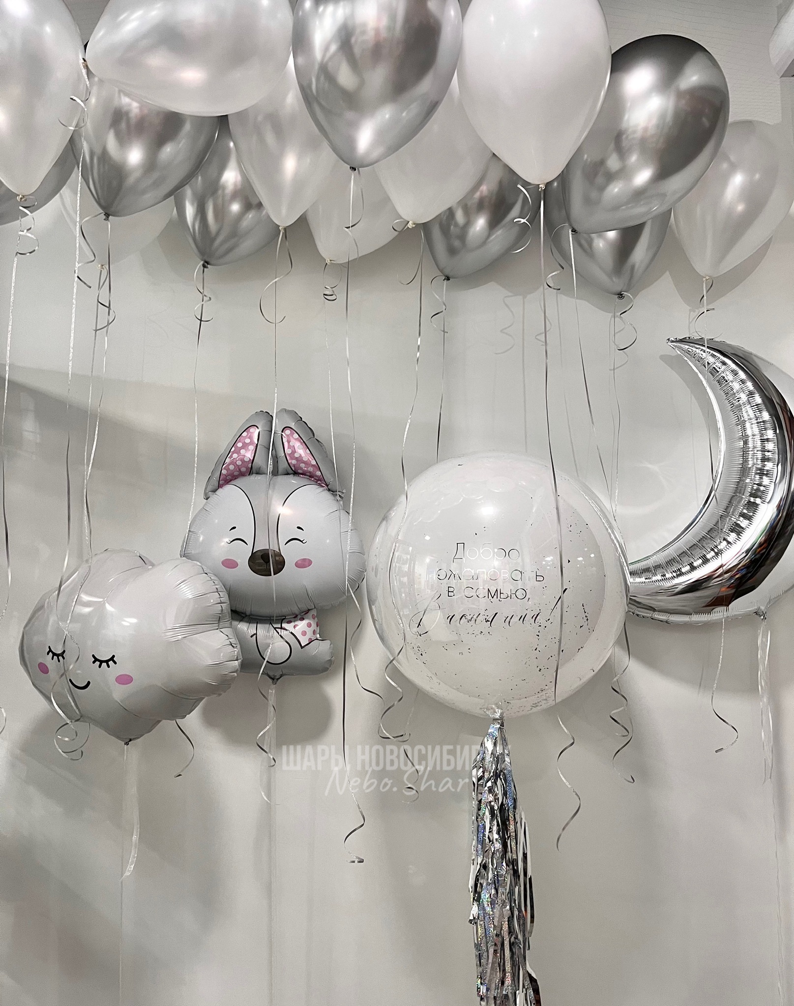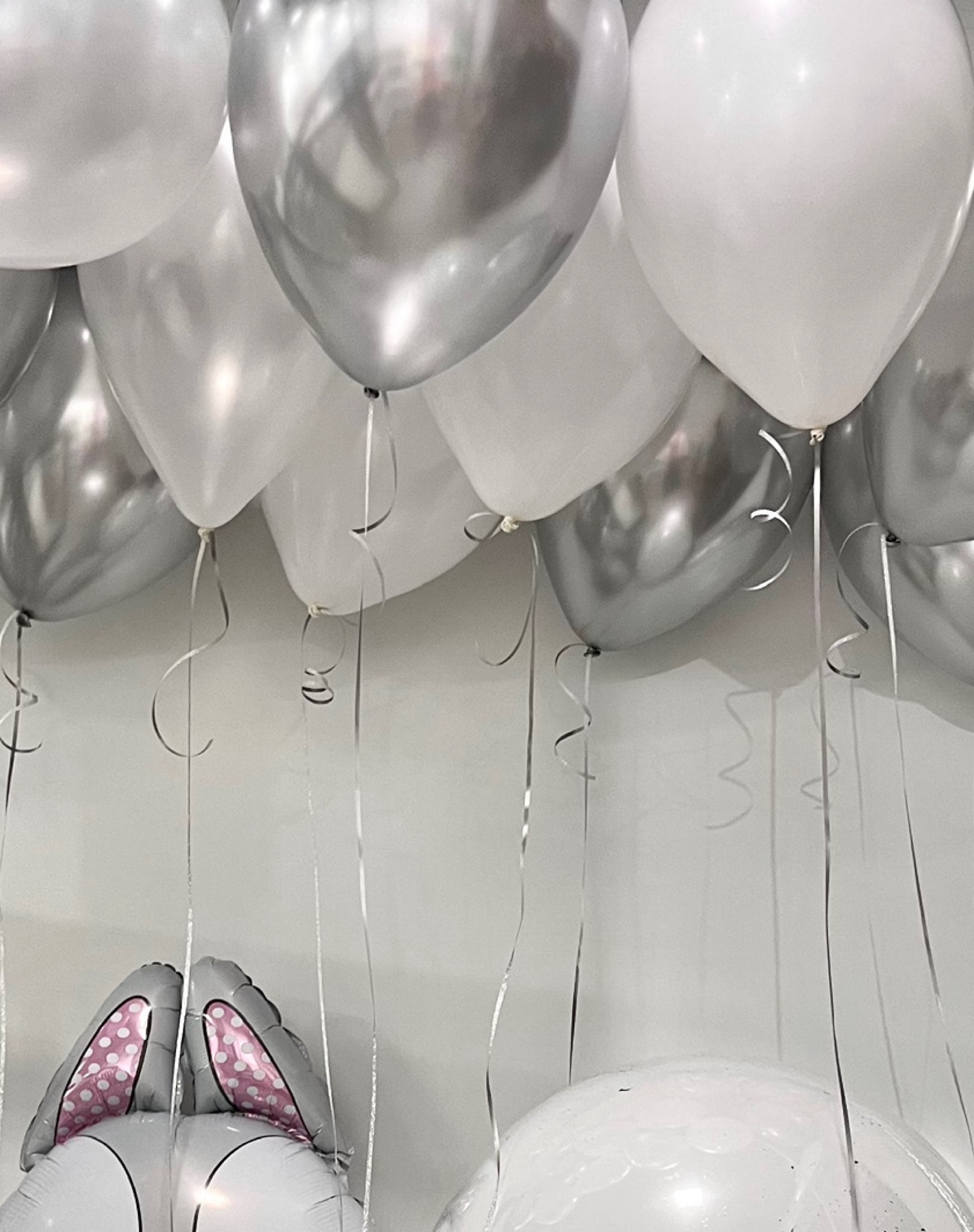 • 15 шаров под потолок (5 хром серебро, 5 жемчужный перламутр, 5 белых)