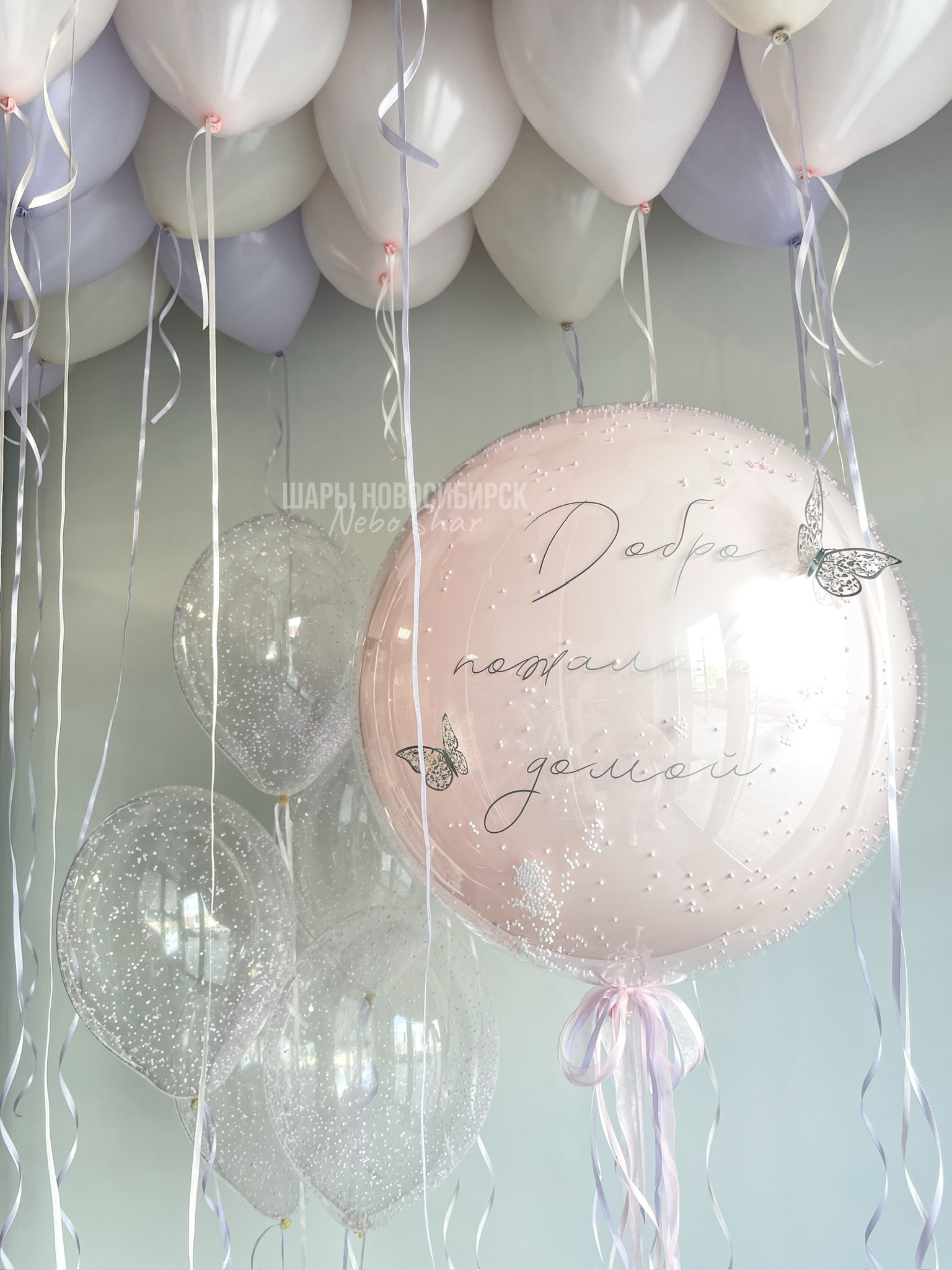 • 20 Шаров под потолок (8 розовый макарунс, 6 сиреневый макарунс, 6 белый песок)