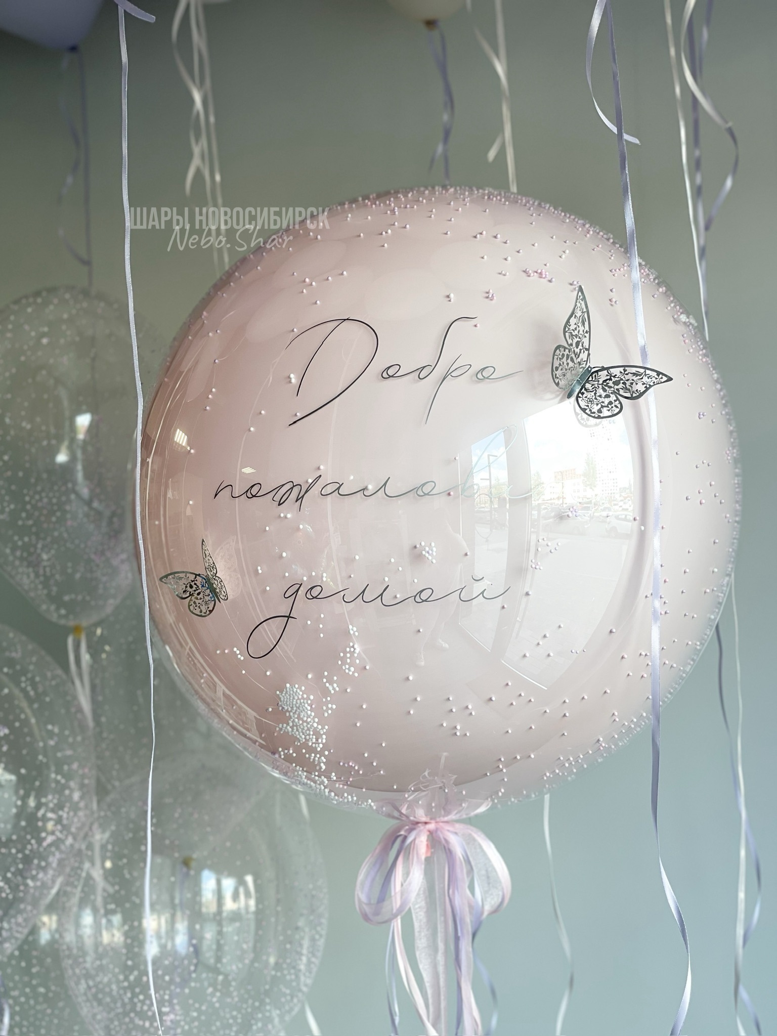 • Стеклянный шар розовый макарунс с пенопластом и надписью, также на шар добавлены бабочки