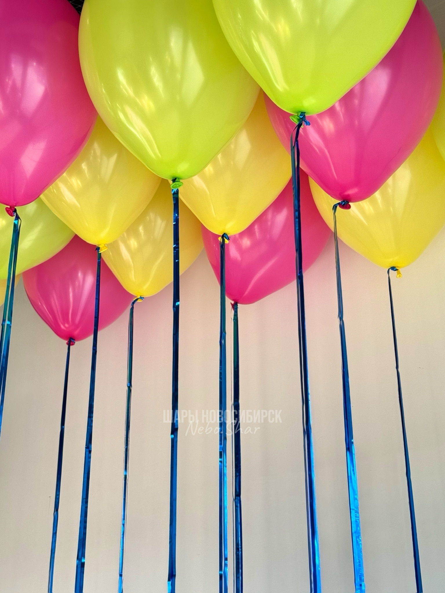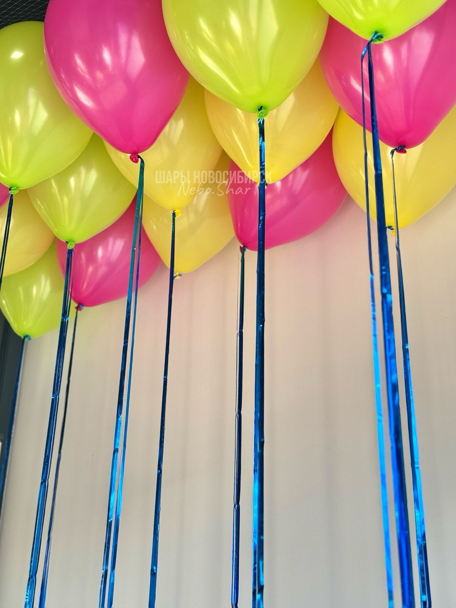 • 15 шаров под потолок на дождике (5 фуксия, 5 яблоко, 5 желтых)