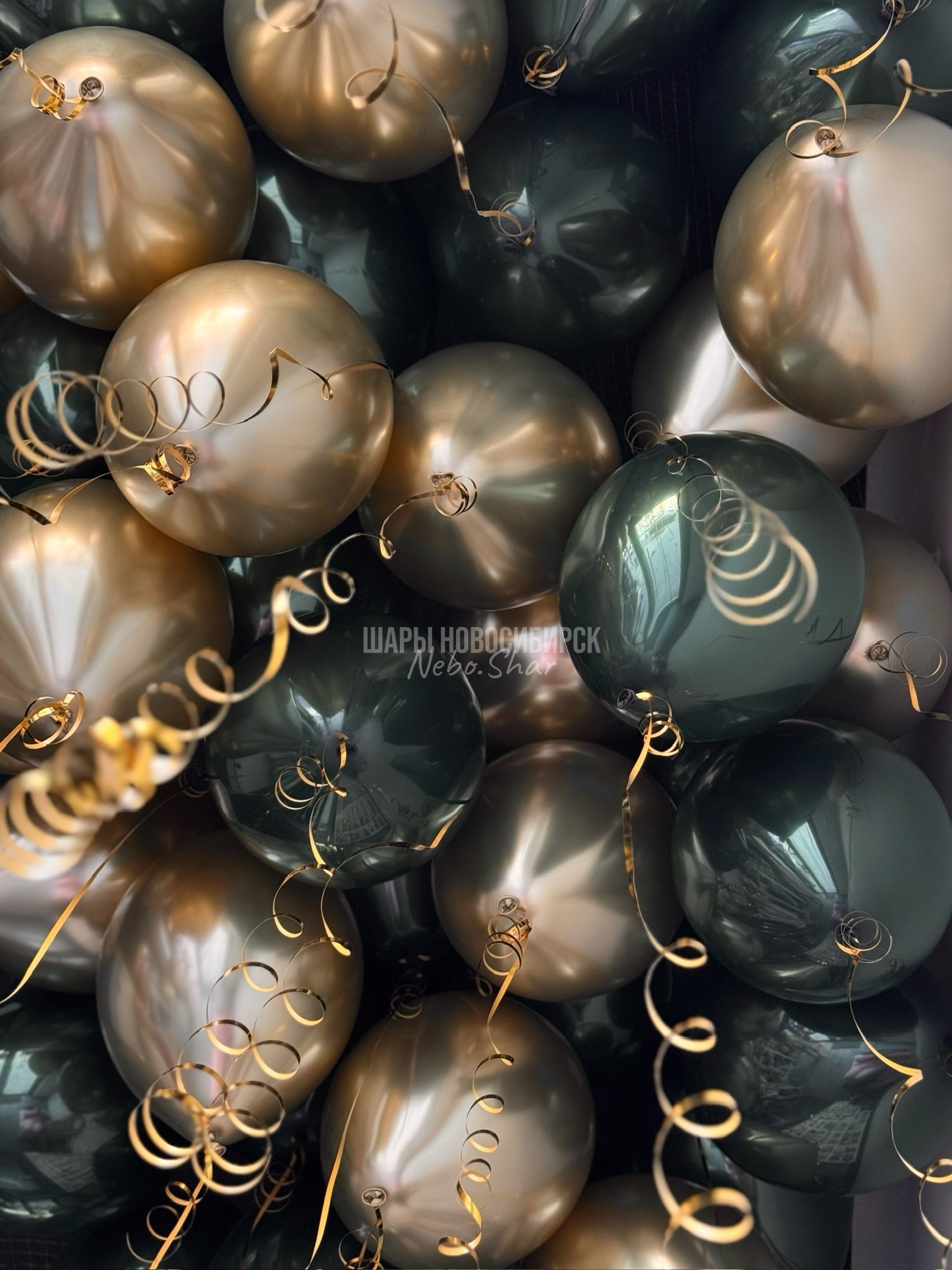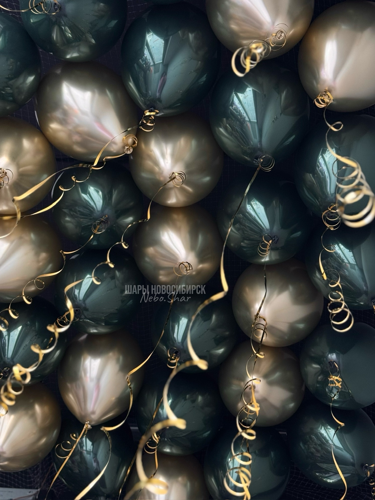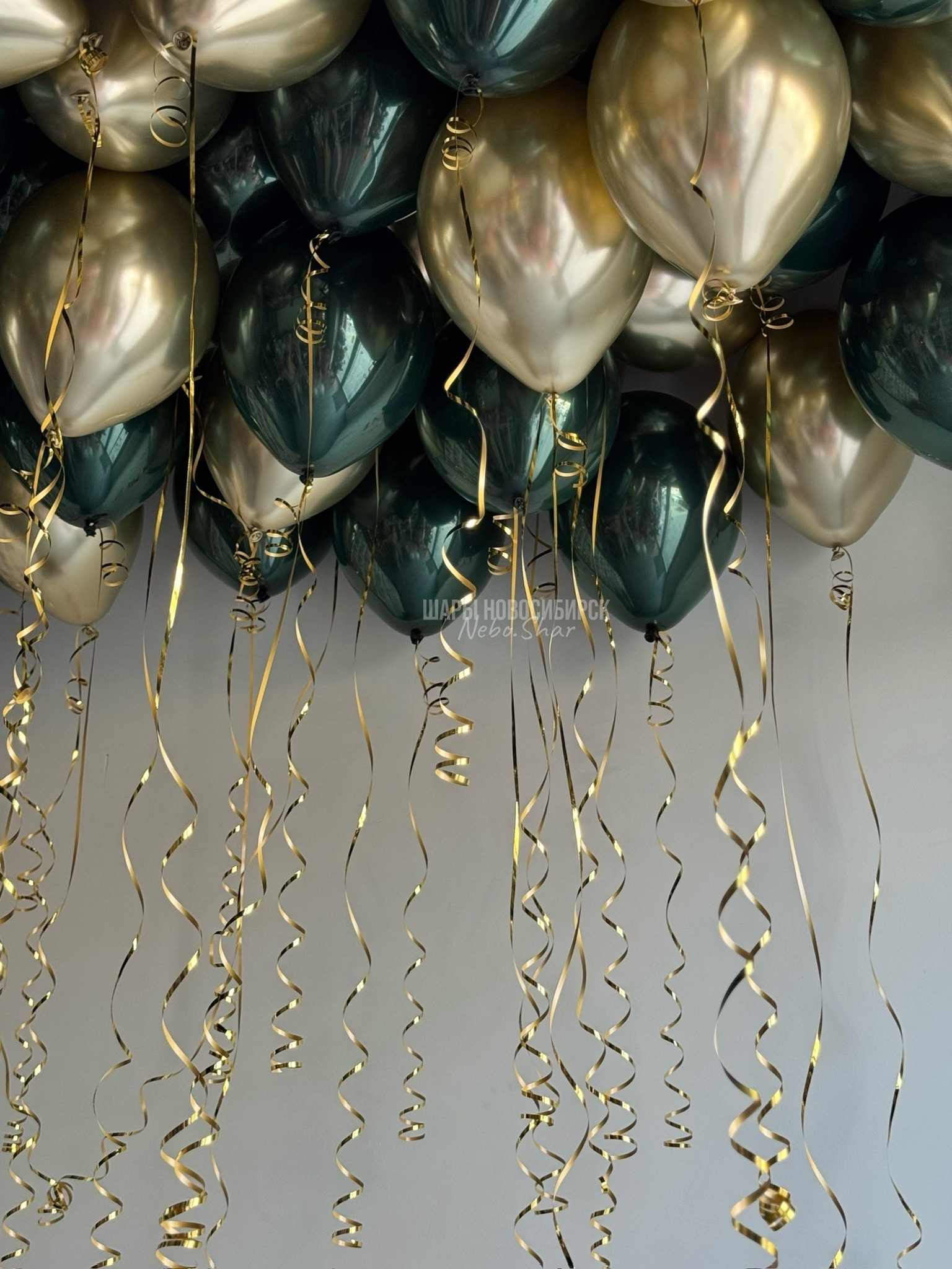• 50 шаров под потолок (25 хром золото, 25 дабл стафф изумрудный)