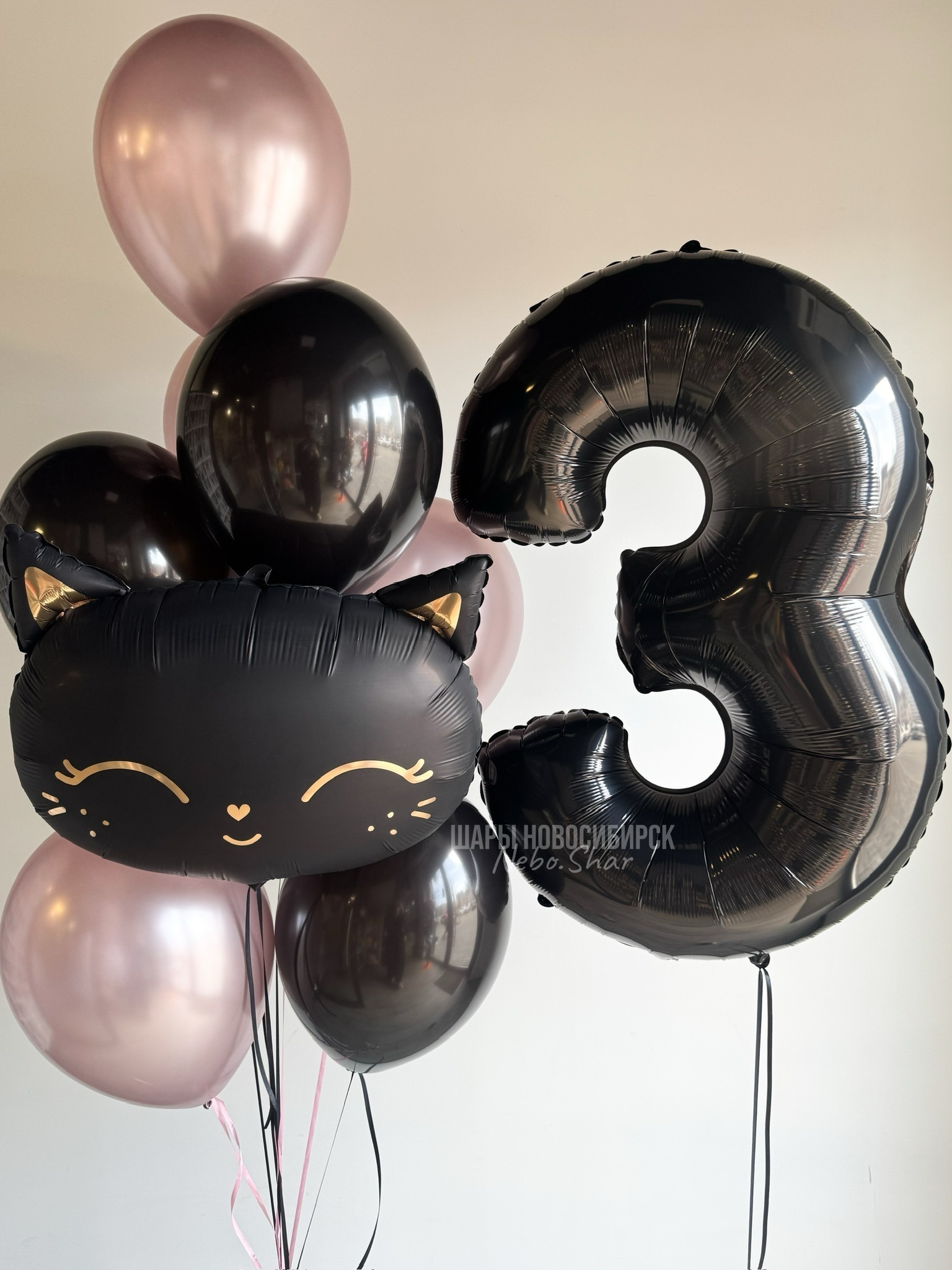 • Фонтан из 9 шаров (4 черных, 4 хром розовый цветок, фигурка «Голова кошка, черный»)