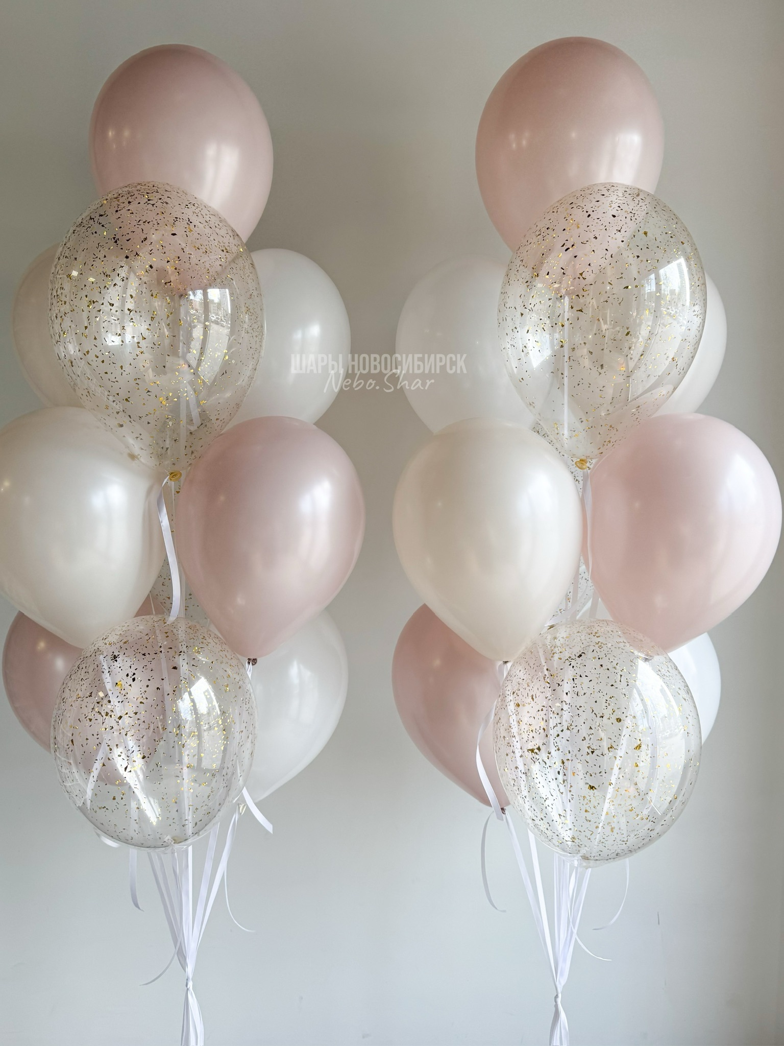 • Два фонтана по 10 Шаров (3 пыльная Роза, 3 прозрачных с конфетти, 2 крем, 2 белый)