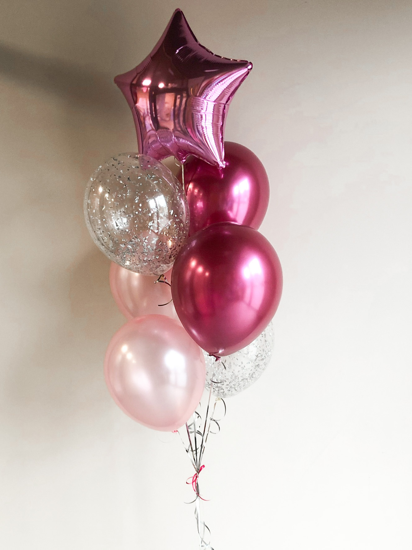- Фонтан из 7 шаров: звезда, 2 с конфетти, 2 хром и 2 однотонных