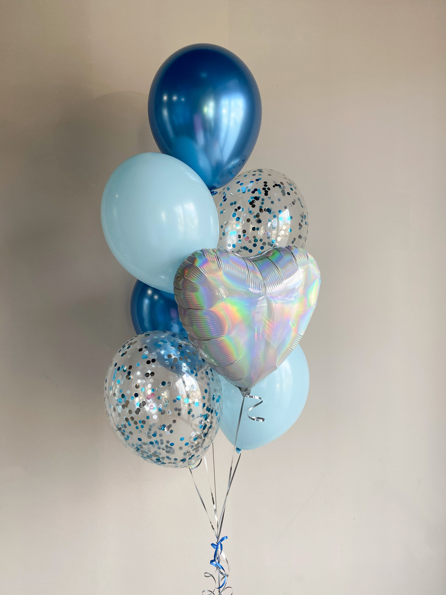 - Фонтан из 7 шаров: сердце перламутр, 2 с конфетти, 2 хром и 2 однотонных