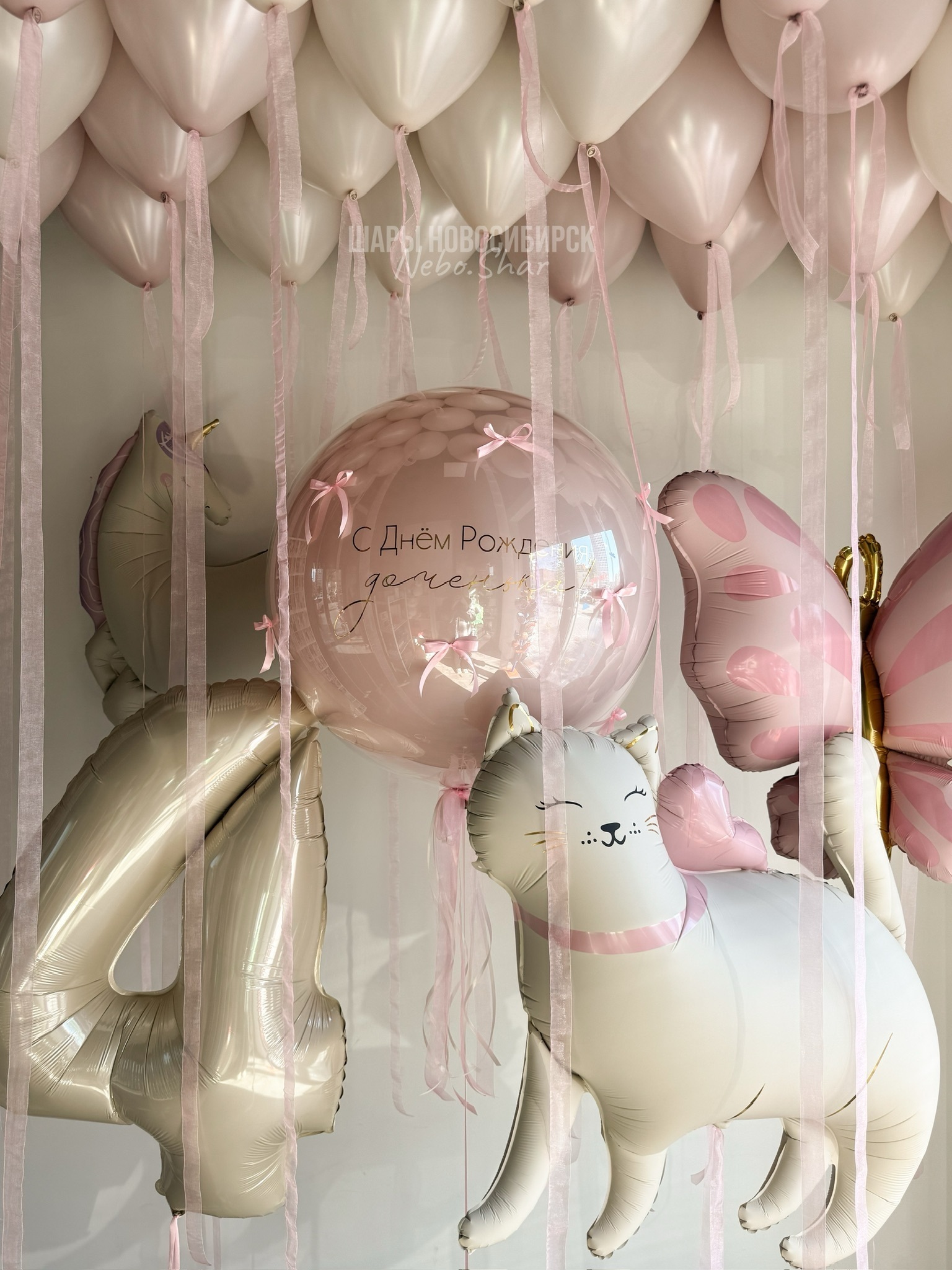 • Стеклянный шар пыльная Роза 60 см с надписью и бантиками по всему шару