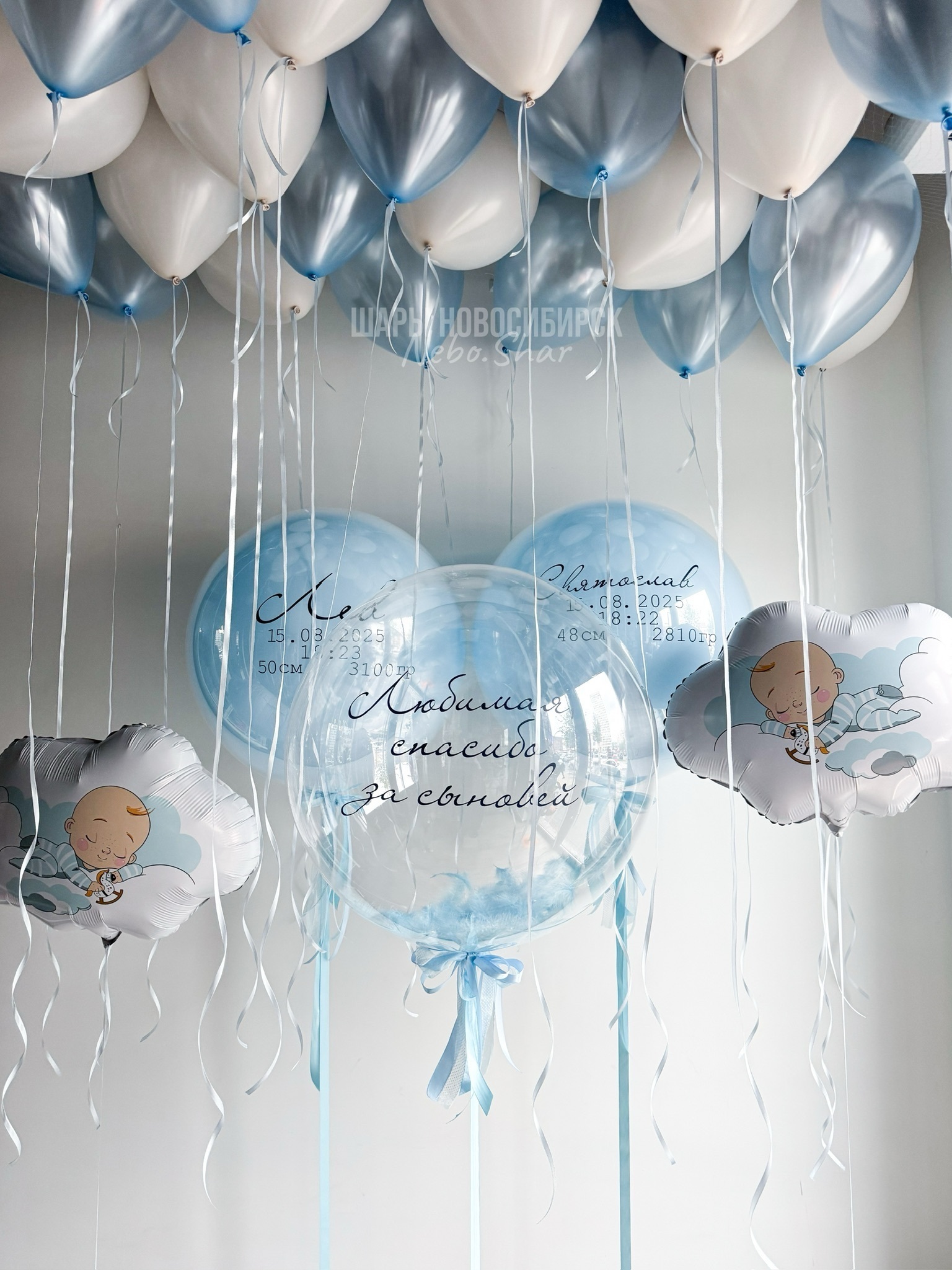 • 25 Шаров под потолок (13 голубой перламутр, 12 крем)