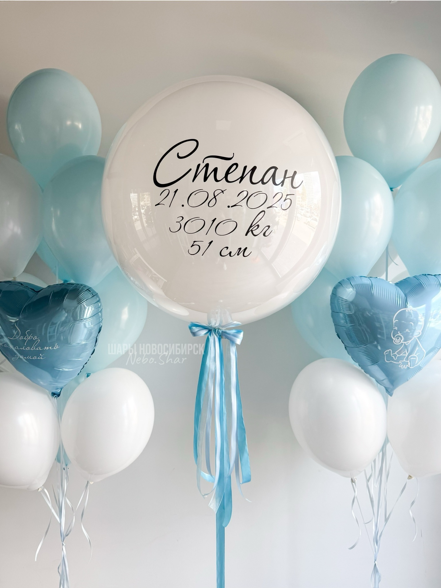 • Два фонтана по 10 Шаров (сердце голубое 45 см, 5 голубой макарунс, 4 белых)