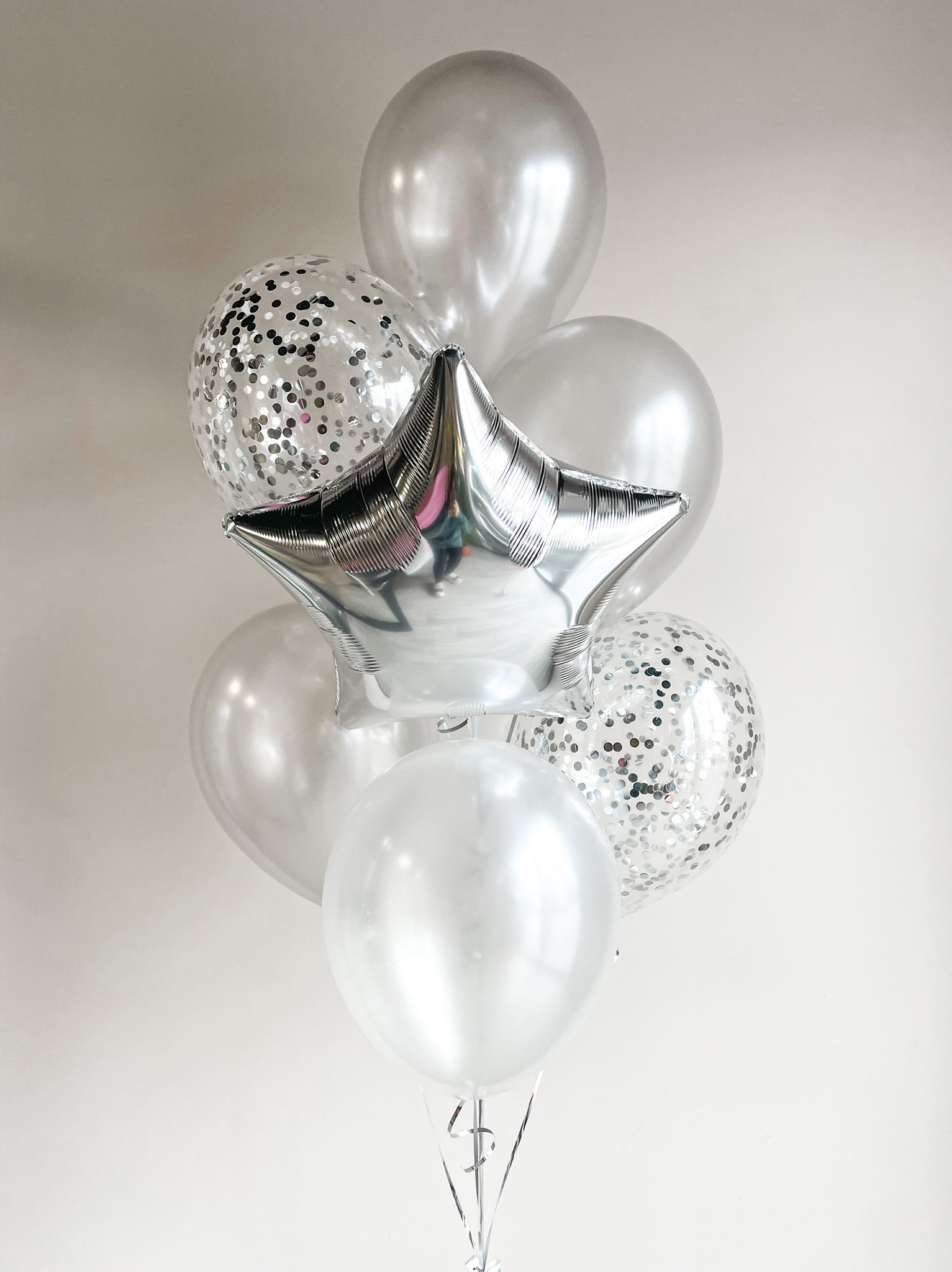 - Фонтан из 8 шаров: звезда, 2 с конфетти и 6 однотонных