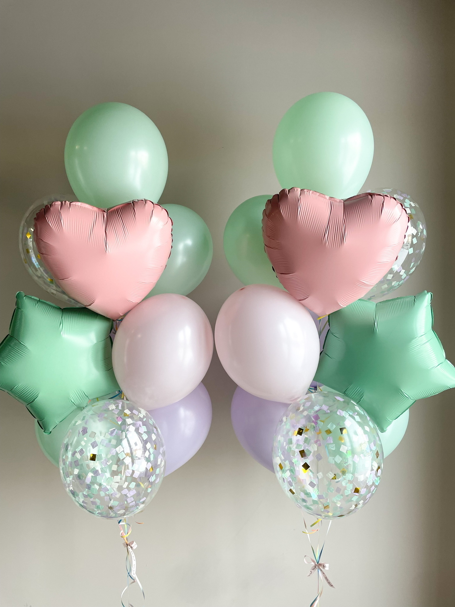 - Два фонтана из 10 шаров: Сердца, звезда, 2 с конфетти, и 6 однотонных.