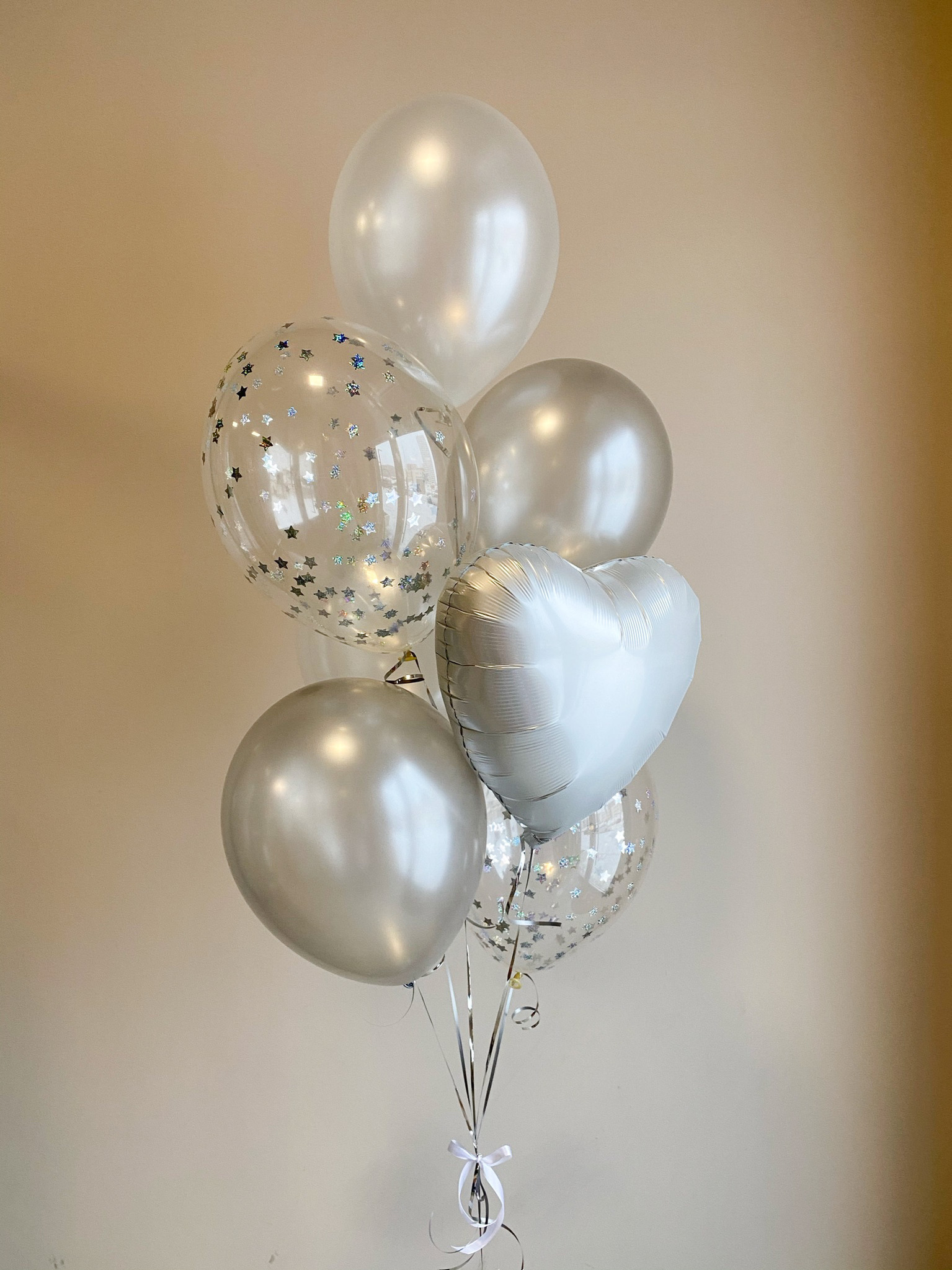 - Фонтан из 7 шаров: Сердце, 2 с конфетти, 4 однотонных.