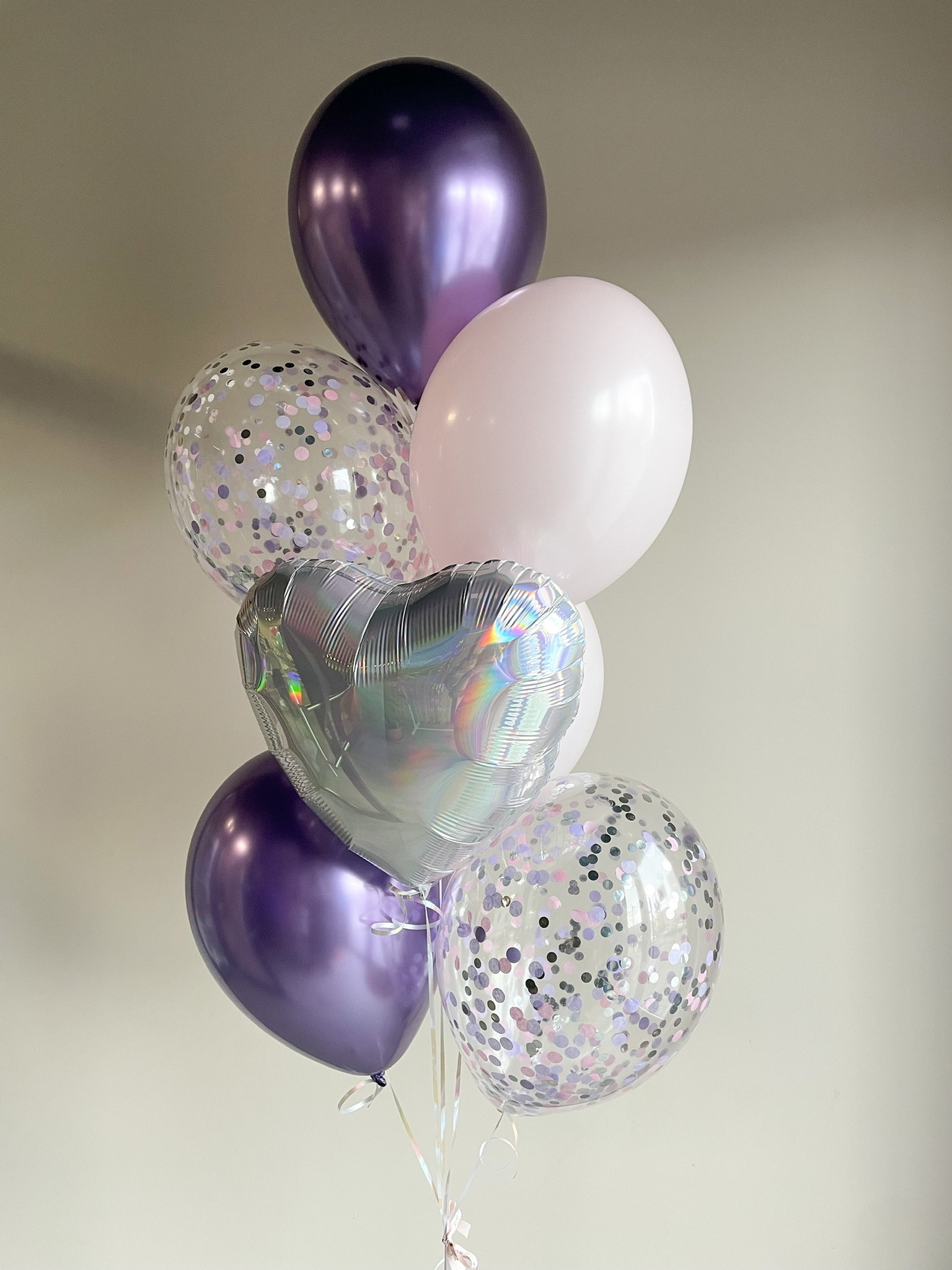 - Фонтан из 7 шаров: сердце голография, 2 с конфетти, 2 хром и 2 однотонных