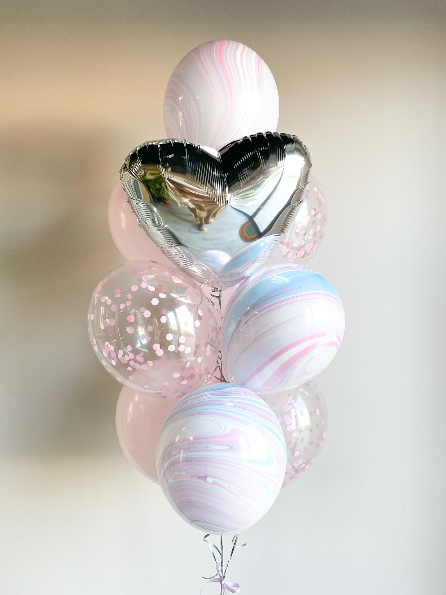 - Фонтан из 10 шаров: сердце , 3 с конфетти, 3 агата и 3 однотонных