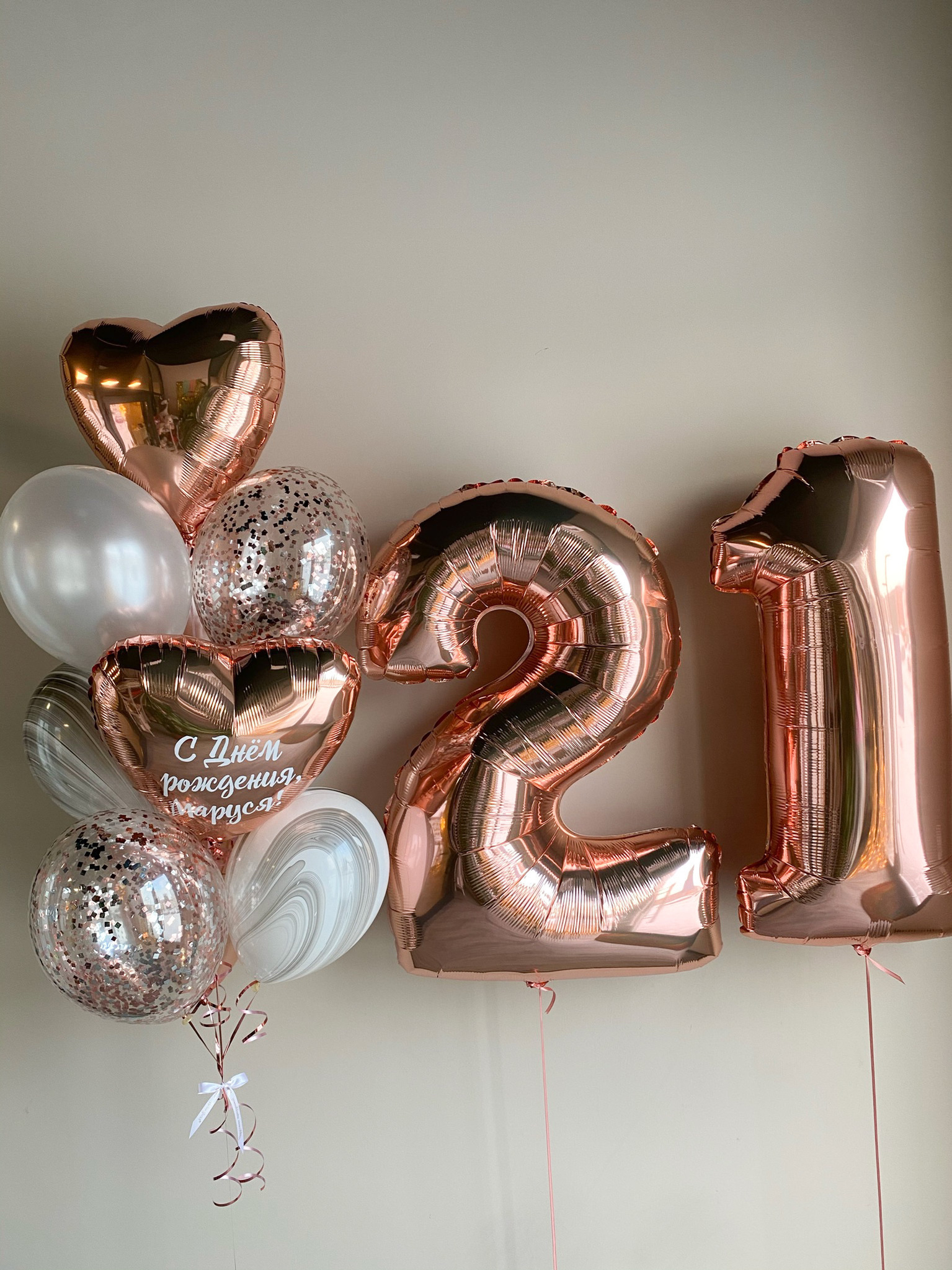 - Фонтан из 10 шаров: сердце с надписью, сердце, 2 с конфетти 2 агата и 4 однотонных.