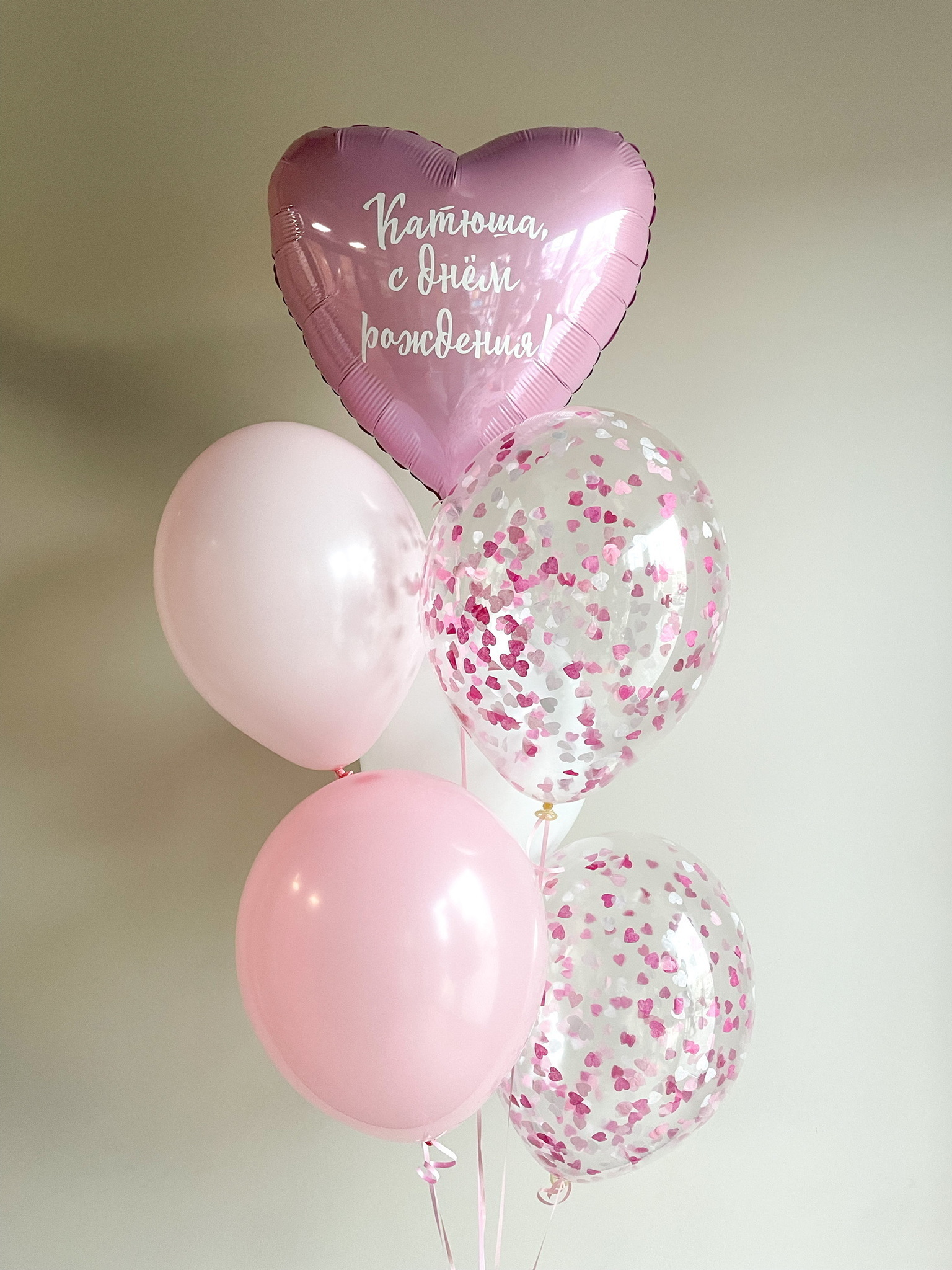 • Фонтан из 6 шаров (сердце с надписью, 1 бабл гам, 1 розовый макарунс, 1 белый, 2 прозрачных с конфетти)