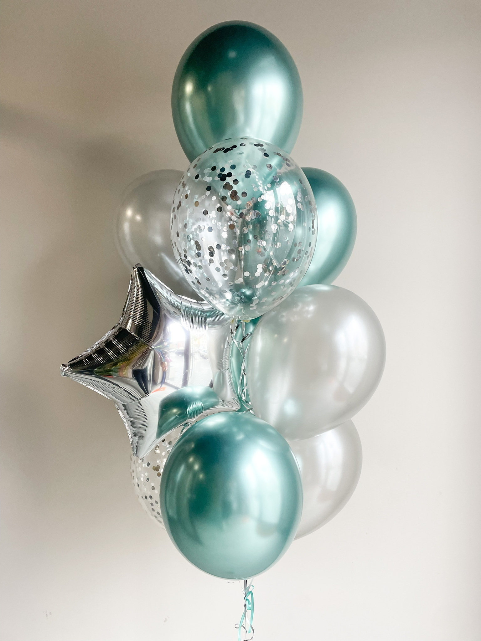 - Фонтан из 10 шаров: звезда, 2 с конфетти, 4 хром и 3 однотонных
