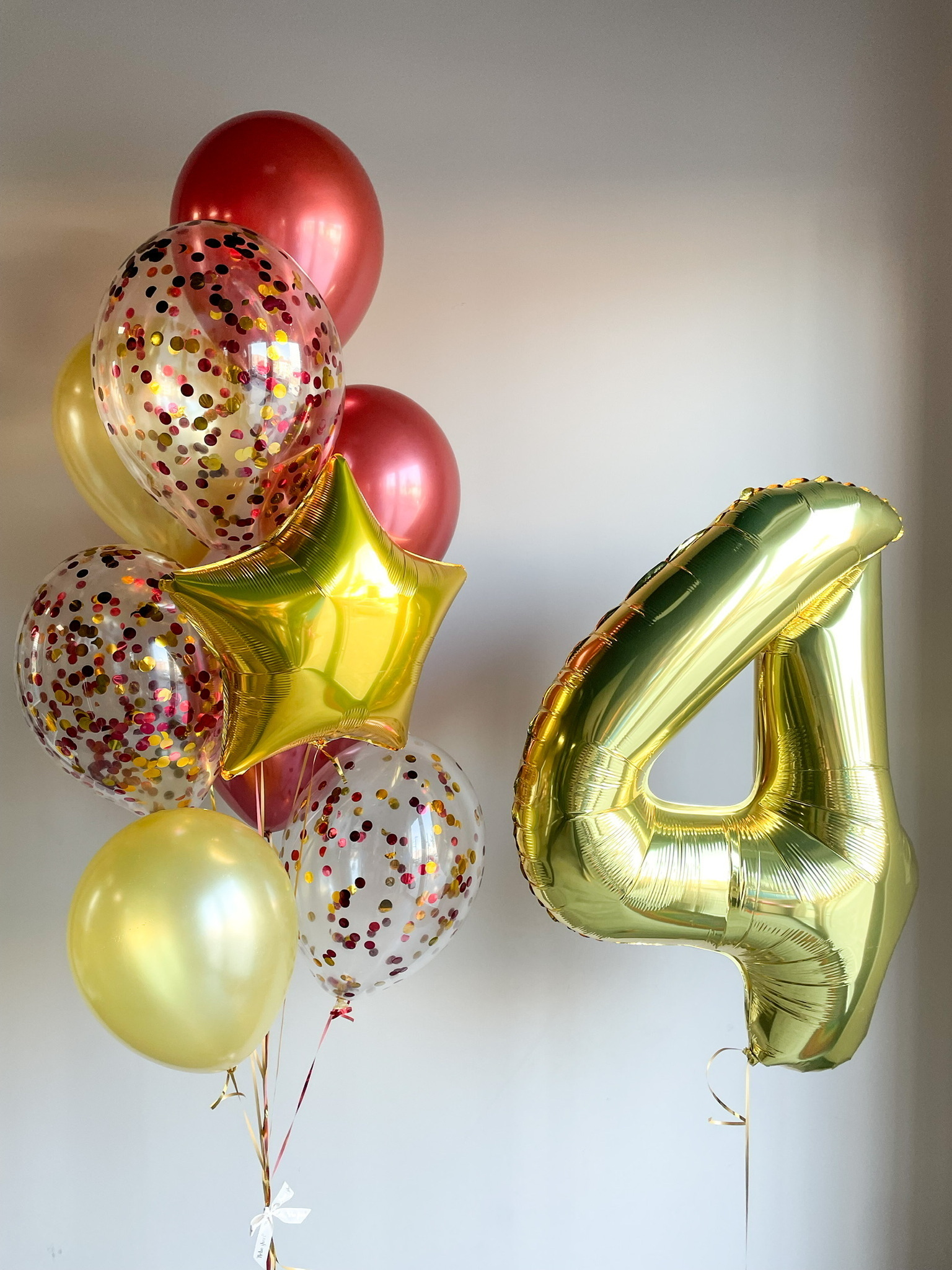 - Фонтан из 9 шаров: звезда, 3 с конфетти, 3 хром и 2 однотонных