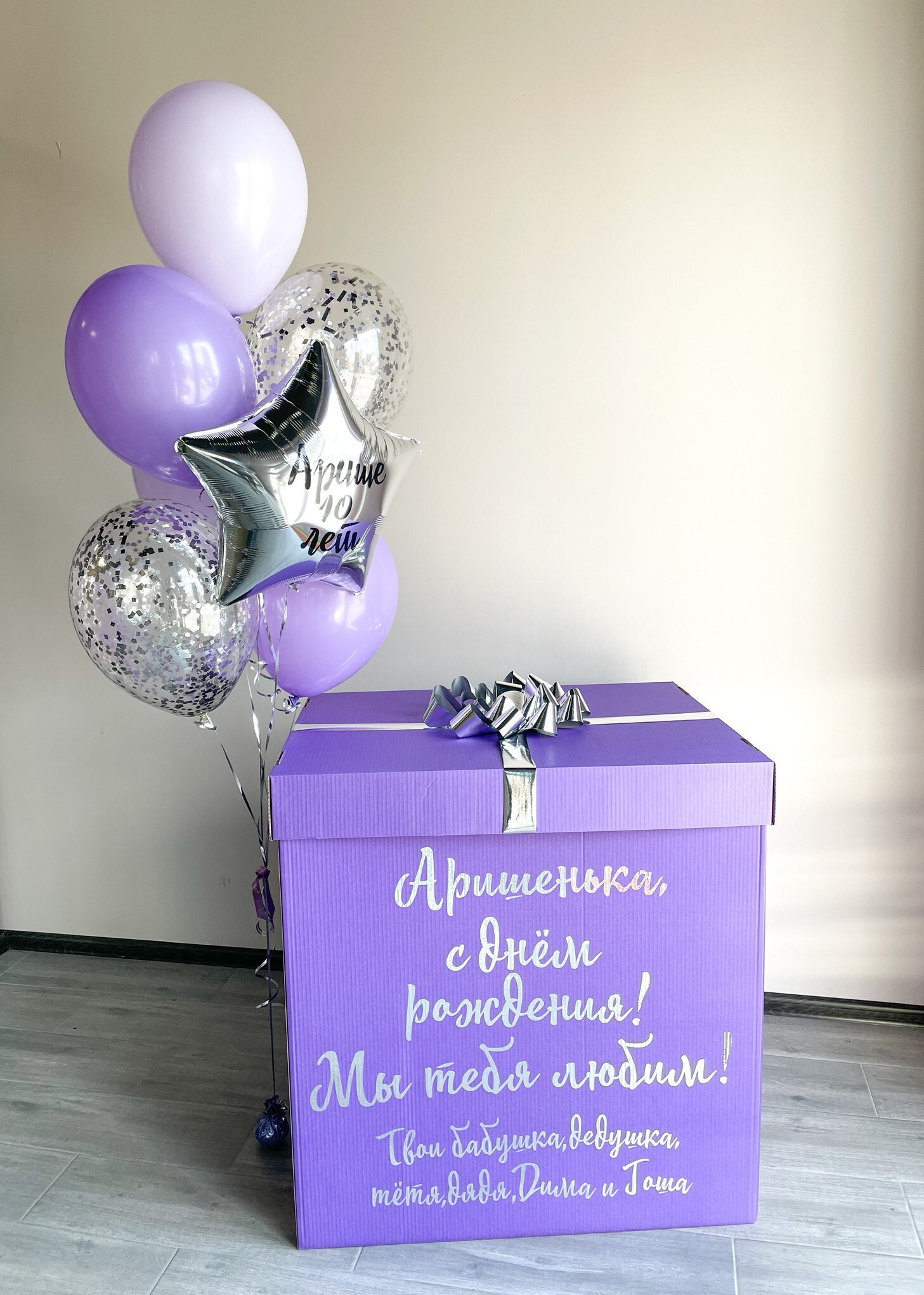 Данный набор возможен с изменением цветовой гаммы, количеством шаров, добавлением индивидуальной надписи:) - Цветная коробка с бантом и индивидуальным оформлением - Фонтан из 7 шаров: звезда с надписью, 2 с конфетти, 4 однотонных.