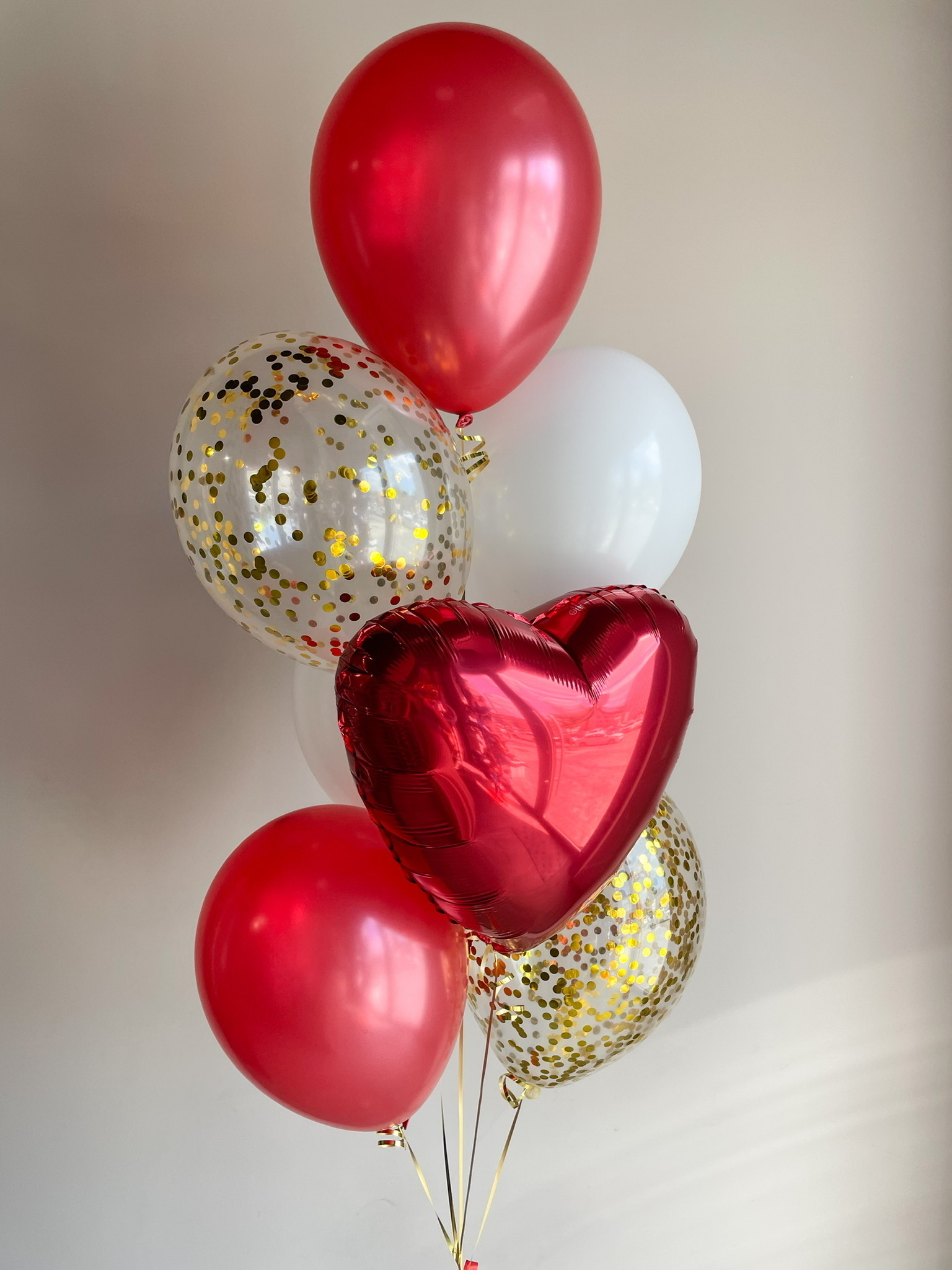 - Фонтан из 7 шаров: сердце, 2 с конфетти и 4 однотонных