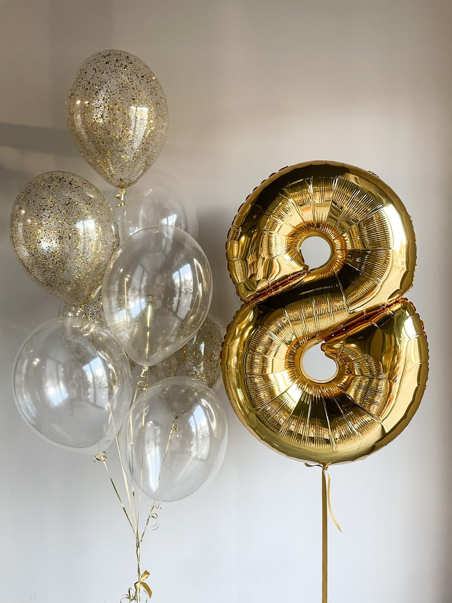- Фонтан из 8 шаров: 4 с конфетти, 4 однотонных прозрачных