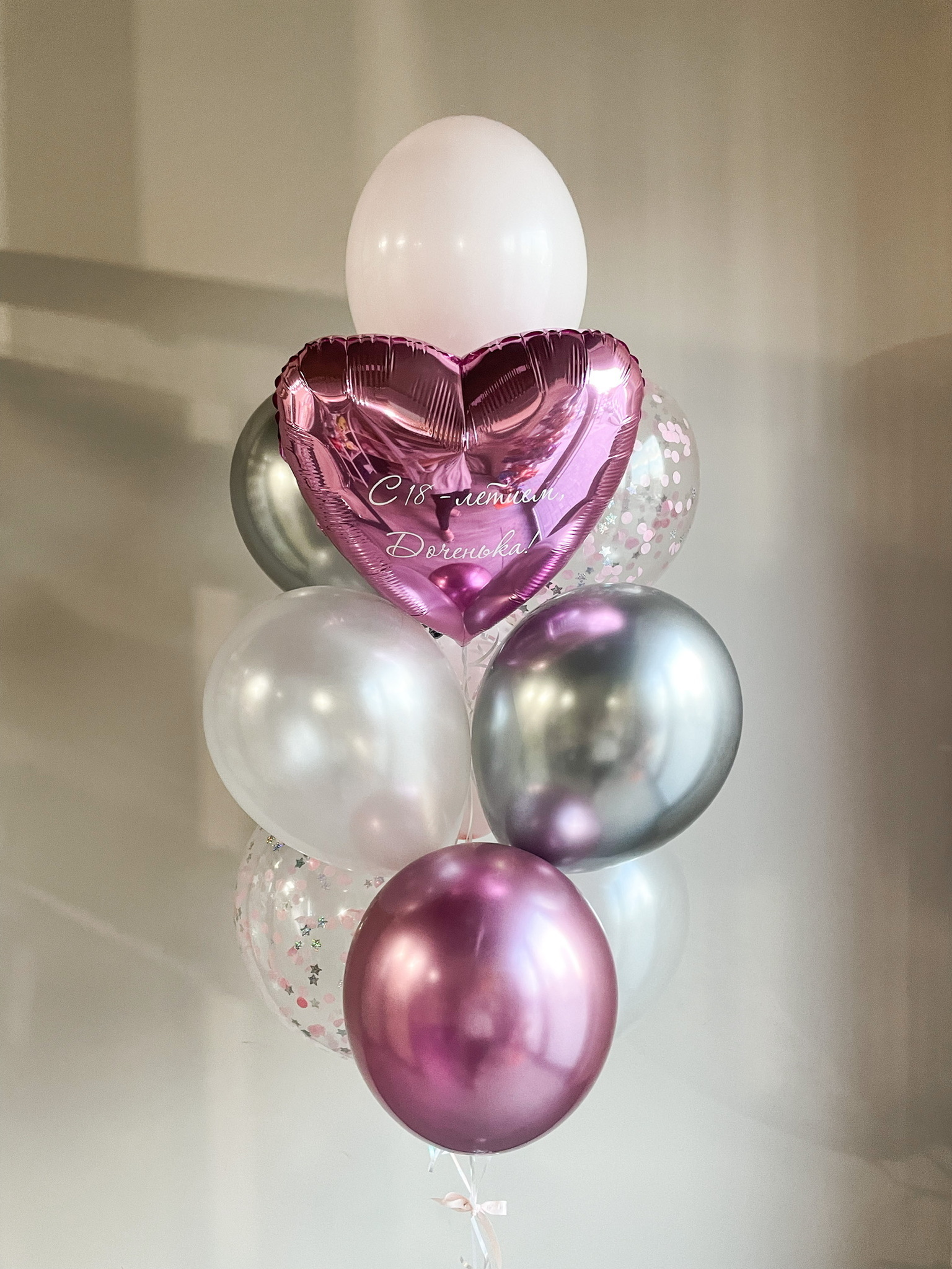 - Фонтан из 10 шаров: сердце с надписью, 3 хром, 2 с конфетти, 4 однотонных