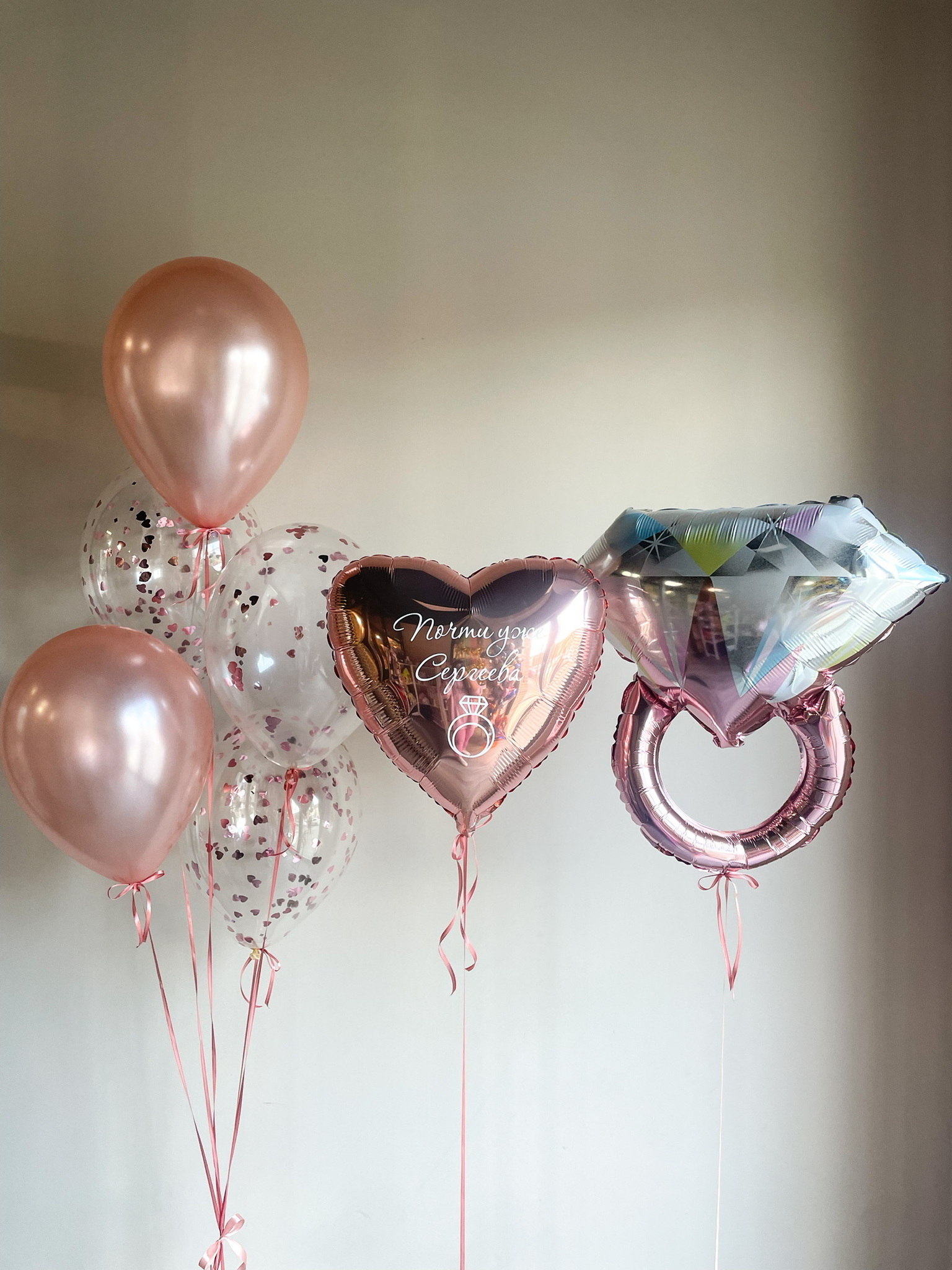 • Фонтан из 5 шаров (3 прозрачных с конфетти, 2 перламутр розовое золото)