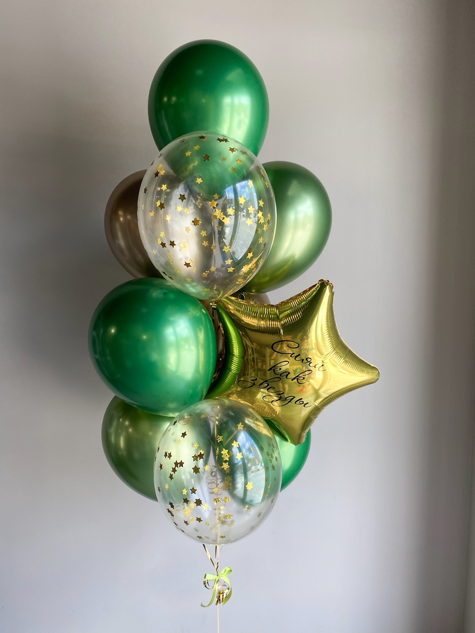 - Фонтан из 10 шаров: звезда с надписью, 2 с конфетти, 7 хром.